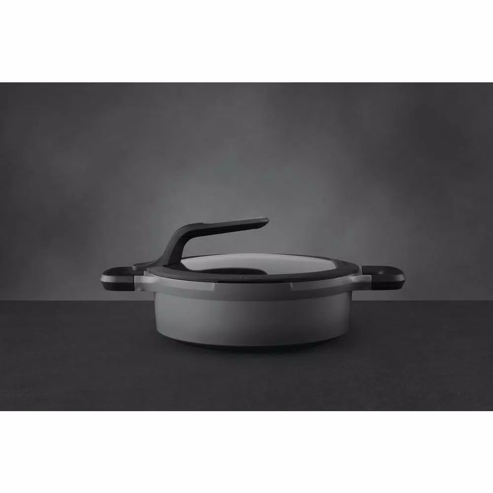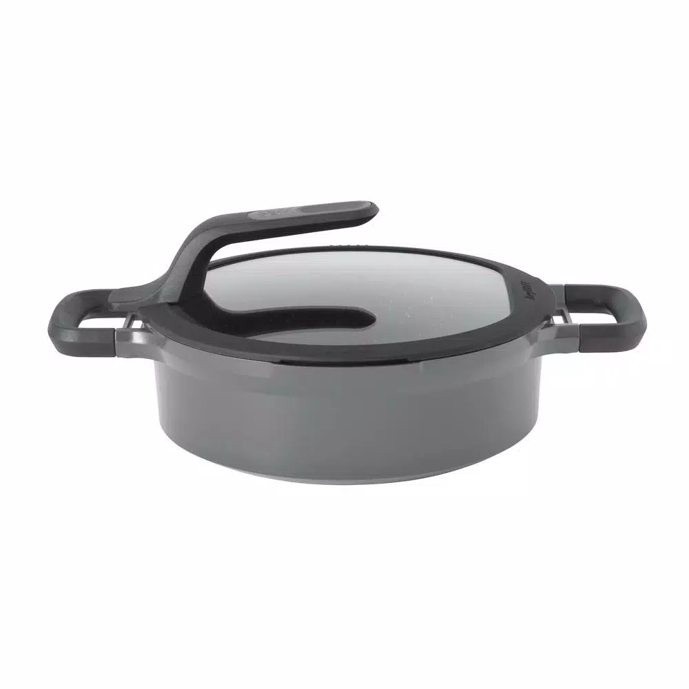 From a Spanish paella to an Indian curry, the culinary world is yours with this covered saut pan! Featuring a lightweight aluminium body thats equipped with stay-cool handles, a high-quality non-stick coating that allows for low-fat cooking and pouring rims for dripless pouring, this 24 cm saut pan is a versatile piece of cookware that youll reach for time and again. Its suitable for any kind of stovetop, including induction, and comes with a convenient glass lid that can be positioned vertically on the pot so you can keep your hands free to stir and serve. Need to strain the ingredients in the pan? Simply pick one of the two straining areas integrated in the lid and its done in the flick of a wrist. Suitable for all cooktops including induction. Inside dimensions: 10x10x3 / Outside dimensions: 14.25x10x5.25