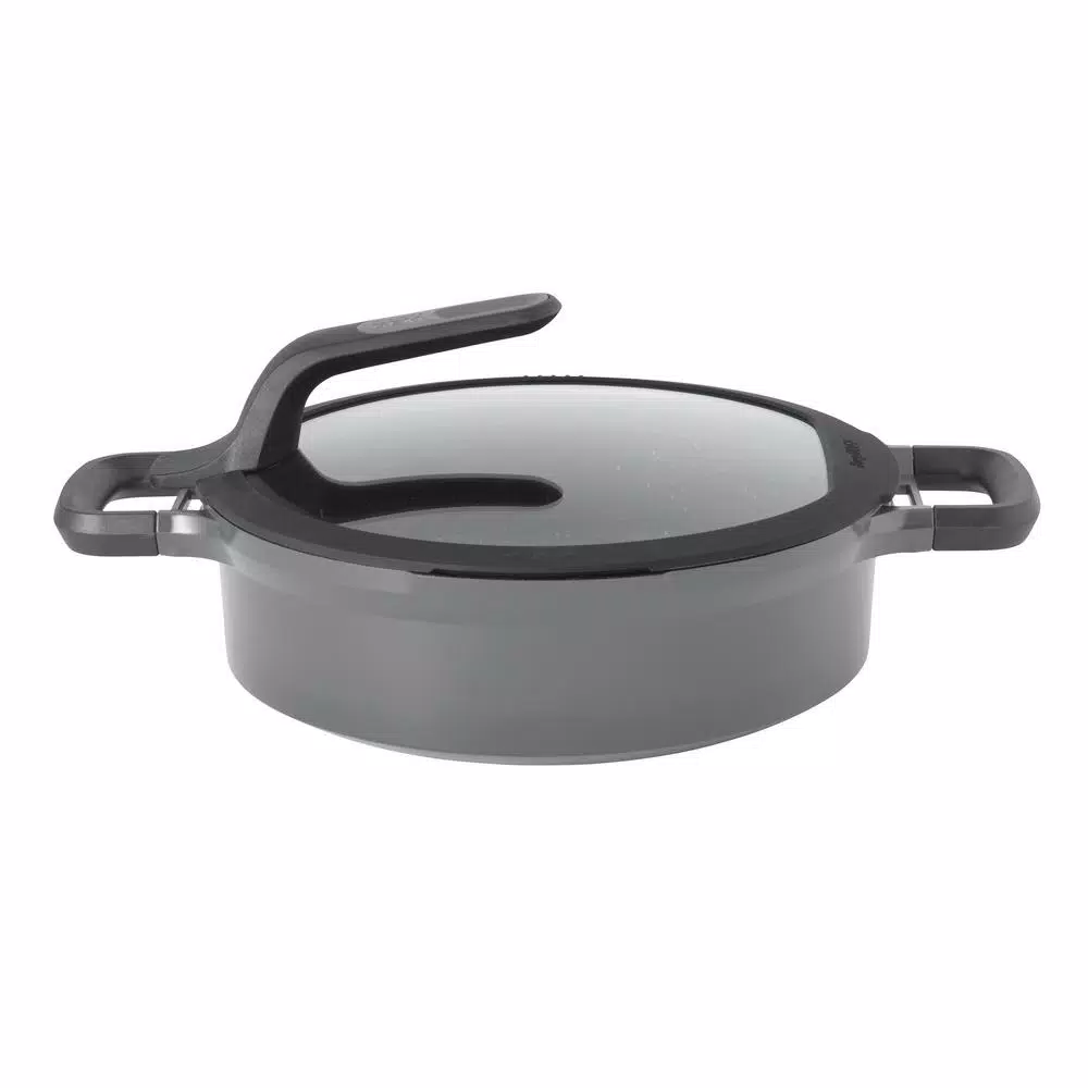 A delicious risotto, sauted vegetables or a sauce thats reduced to perfection, whatever you fancy for your next meal, this covered saut pan is the perfect tool to help you prepare it. The pans lightweight aluminium body is suitable for any kind of stovetop, including induction, and has a high-quality non-stick coating so you can cook with little to no oil without having to worry about food sticking to the pan. An added bonus are the stay-cool handles that ensure a safe and comfortable grip and the clear glass lid that features two different sized pouring areas so you can use the pouring rims to strain various ingredients without even lifting the lid. Want to stir or serve your food? Just place the lid vertically on the body of the pan and youve got your hands free to do your thing. Suitable for all cooktops including induction. Inside dimensions: 11x11x3 / Outside dimensions: 16.25×11.5×5.5