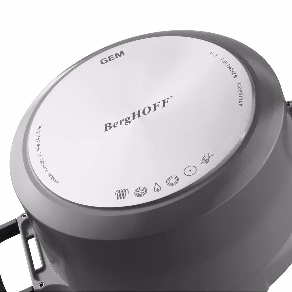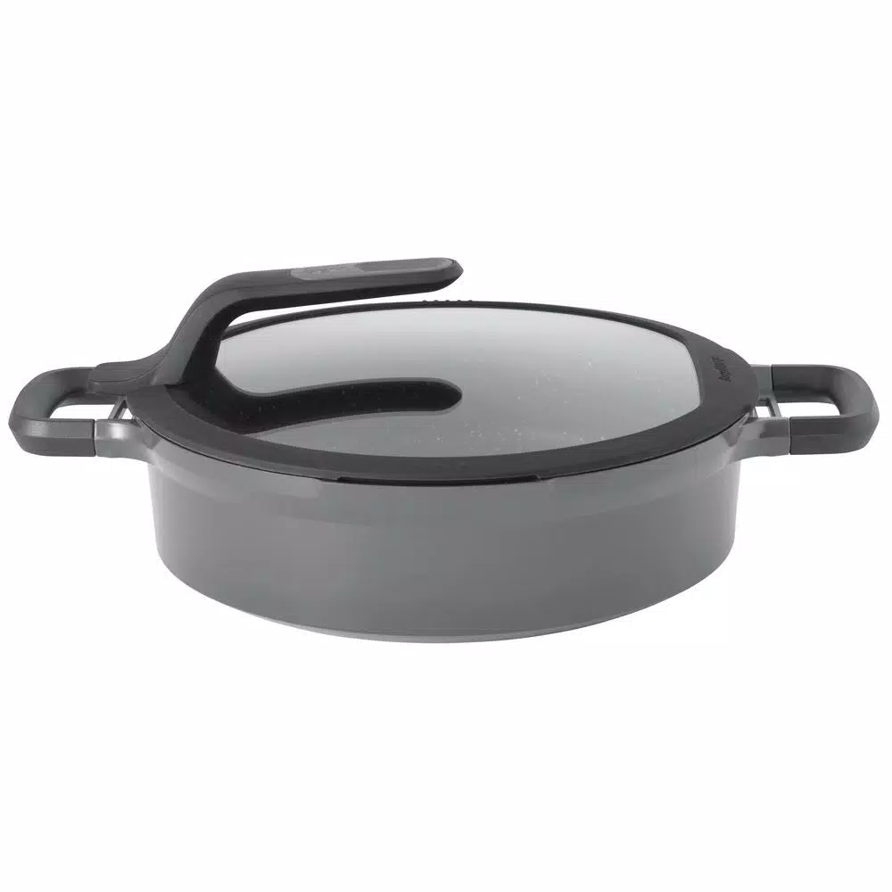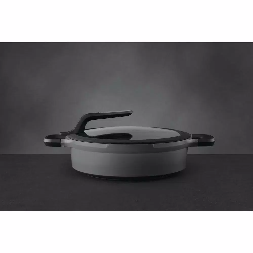 Got a frying, sauting or braising job to do? Then its time to get out this covered saut pan and work your magic on any kind of stovetop! Simply grab the stay-cool handles, add your ingredients to the aluminium body with high-quality non-stick coating and top the pan off with the matching lid that preserves the heat and moisture for energy-efficient cooking and an extra tasty result. When your food is ready you can either strain it with the different sized straining areas integrated in the lid or place the lid vertically on the pot so youve got your hands free to stir and serve. Suitable for all cooktops including induction. Inside dimensions: 11x11x3 / Outside dimensions: 16.25ร11.5ร5.5