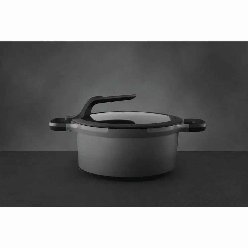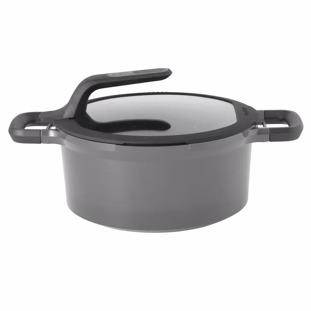 Whether youβre making a one-pot dish for a family of four or a batch of soup that will last a couple of days, with this covered stockpot youβll have it ready in no time. The lightweight aluminium body is very easy to lift with the stay-cool handles and works on any kind of stovetop, including induction. On top of that, the pot features a high-quality non-stick coating, pouring rims for dripless pouring and a clear glass lid with two integrated pouring areas for precise straining of various ingredients. Want to stir or serve the contents of the pot. Just place the lid vertically on the body so youβve got your hands free to give your dish that finishing touch. Suitable for all cooktops including induction. Inside dimensions: 10 in. x 10 in. x 4.25 in. / Outside dimensions: 14.25 in. x 10.75 in. x 7 in.