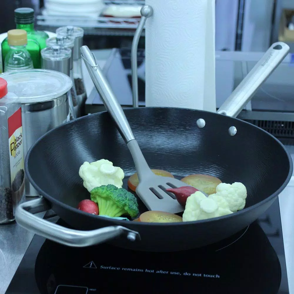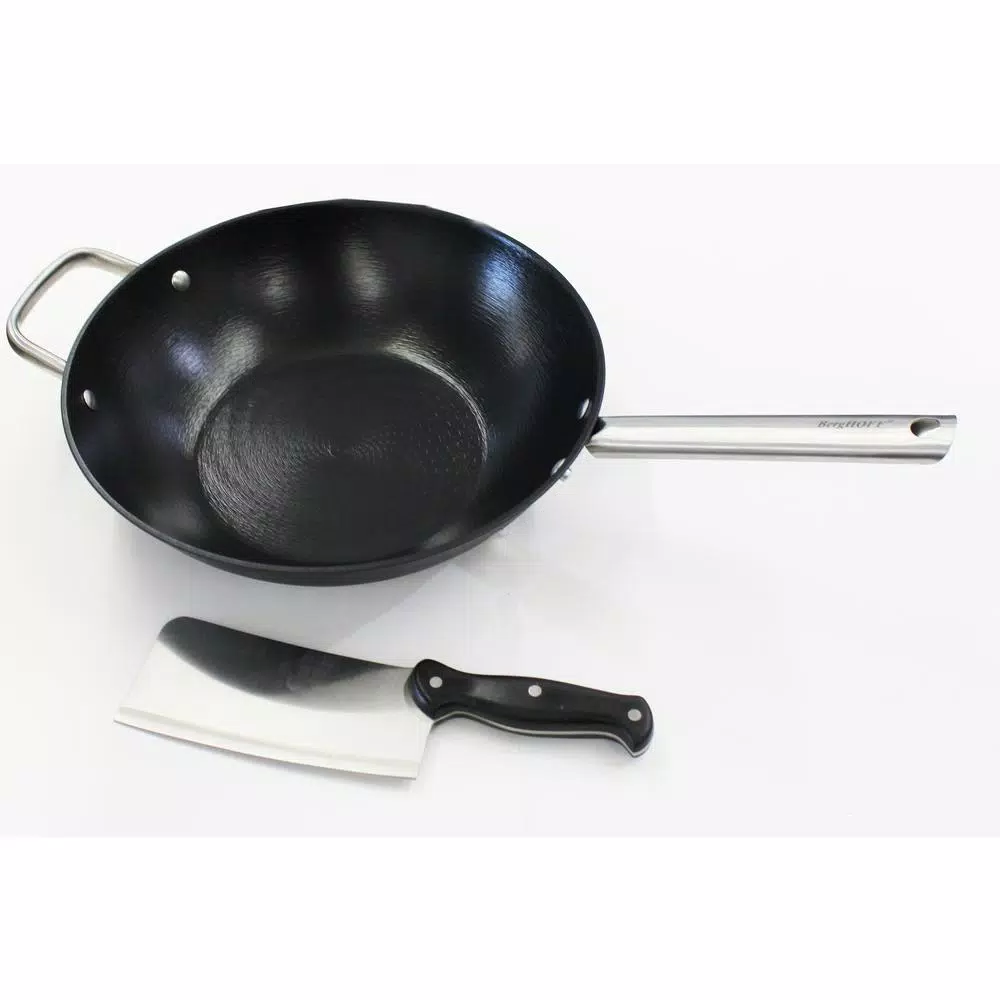 For a quality, reliable choice, this Geminis 12.5 in. spun cast iron wok and cleaver set is hard to beat. Made with a non-stick, eco-friendly, 3-layer ferno ceramic coating that is PFOA and PTFE free, this wok is sure to be a long-lasting addition to your kitchen. Easily cleaned with soap and water. Requires no seasoning. Features 18/10 stainless steel handles. The included 7 in. cleaver features a triple-riveted handle that provides a strong, secure grip that makes chopping your meats a snap.
