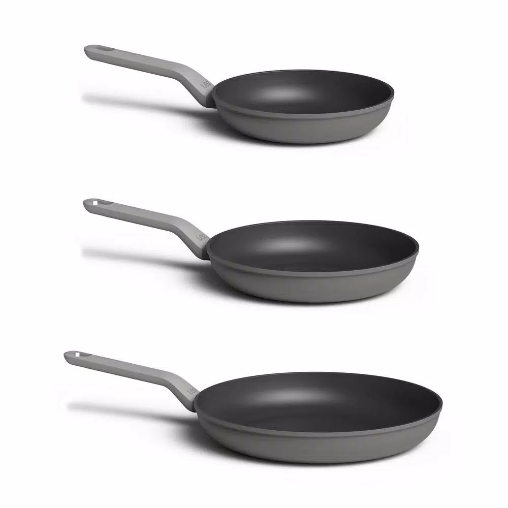 A variety of sizes when you want to make an omelet or fry some meat for two, these aluminum frying pans helps you to prepare your food in a jiffy on all types of stove tops, induction included. The aluminum provides a fast and even heat. Set includes: 8 in. Non-Stick Fry Pan, 10 in. Non-Stick Fry Pan, 12 in. Non-Stick Fry Pan.
