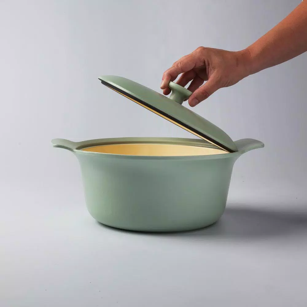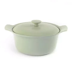 Give your cooking a professional edge with this Ron, 4.4 Qt., green stockpot. Made from durable cast iron, this dish will retain and release heat far more efficiently than other metals, ensuring your meals, broths, and stews are cooked thoroughly and evenly. Wide-grip handles offer a secure grip, even while wearing oven mitts. Hand wash recommended.