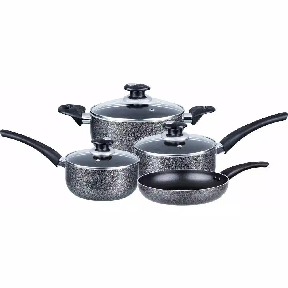This 7-piece Cookware Set is made of 2.5 mm Heavy Gauge Aluminum to handle your cooking needs. This set has long-lasting heat-resistance Bakelite handles and knobs. Box includes 1-1/2 Qt. Sauce pan, 2 Qt. Sauce pan, 5 Qt. Dutch oven, 3 Lids and a 9-1/2 in. Fry pan.