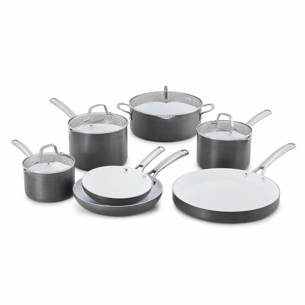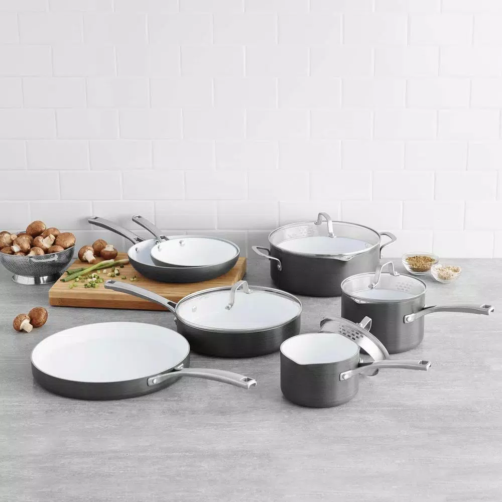 Stay ready in kitchen with this Calphalon Classic Ceramic Nonstick 11-Piece Cookware Set. Equipped with a selection of fry pans, saucepans and a saute pan, these pots and pans will save you time. They conveniently come with fill lines, straining covers and pour spouts so there is no need for extra cookware, such as colanders, strainers and measuring cups. This versatile cookware set is made from PFOA-free, nonstick ceramic for easy cleaning and hard-anodized aluminum for quick, even heating. It features stainless steel, comfort-grip handles that remain cool to the touch on the stovetop. You’ll be ready to cook up a meal every day with this set in your culinary arsenal.