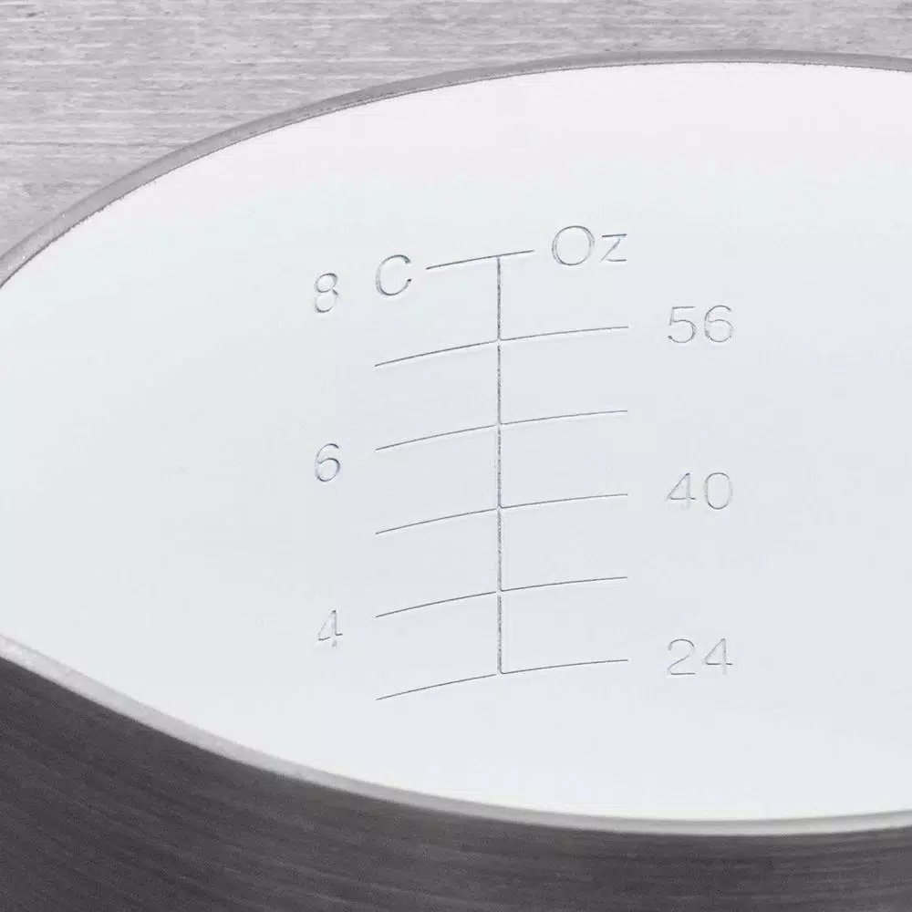 - Convenient measuring marks pour spouts and straining lids on select pans