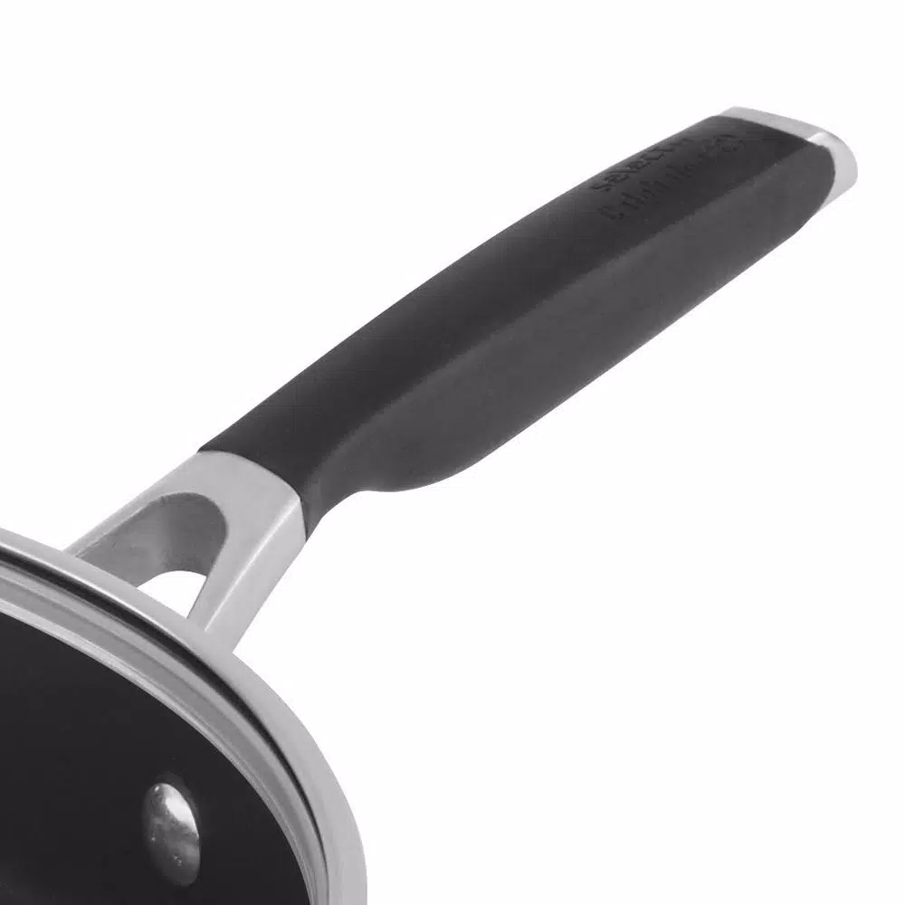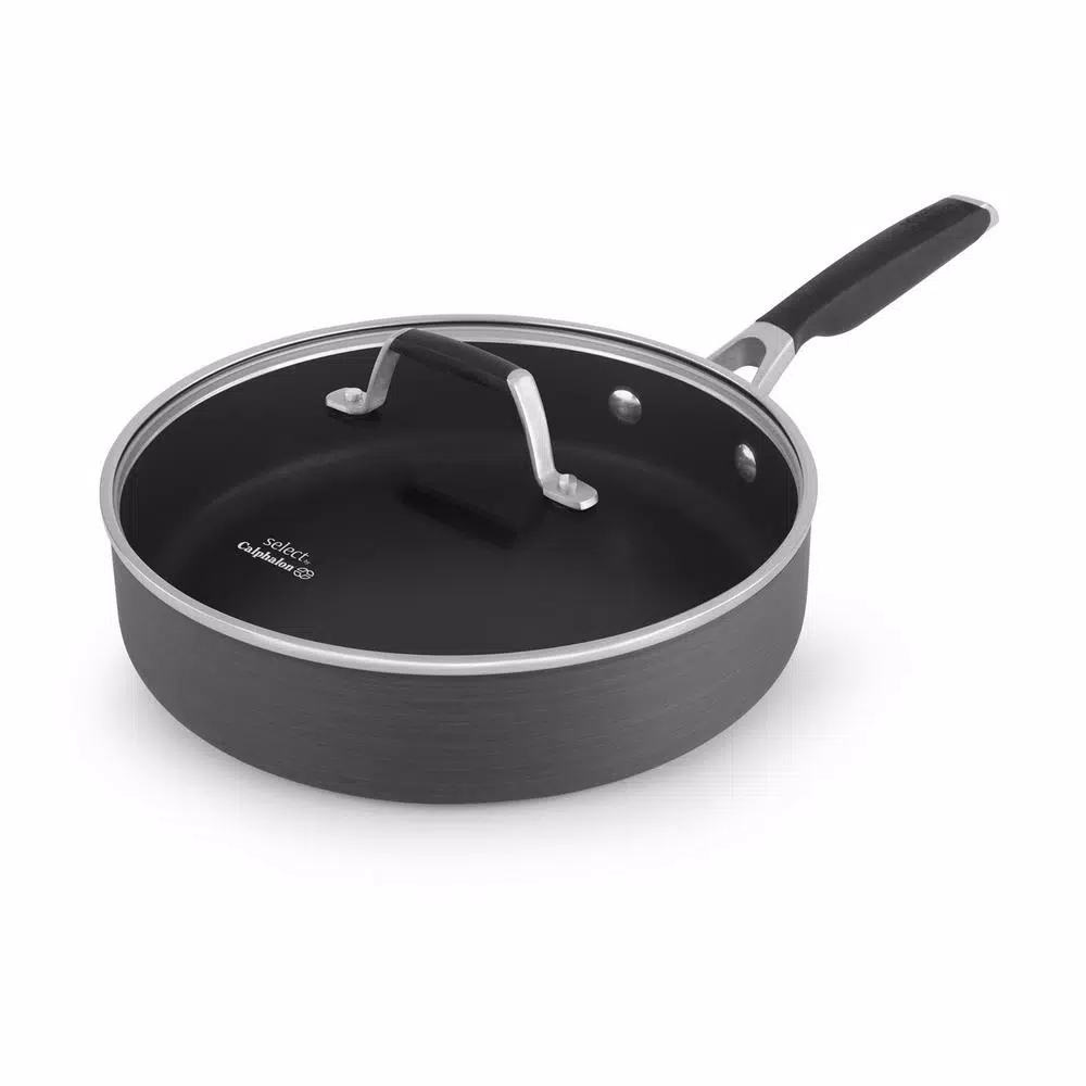 The Select by Calphalon Hard-Anodized Nonstick 3 Qt. Saute Pan is designed for easy meal preparation any day of the week. Crafted from hard-anodized aluminum, this saute pan is durable for everyday cooking and distributes heat evenly so your recipes turn out beautifully. From batches of chili to sauteing vegetables and searing chicken, the nonstick interior allows for easy food release and makes cleaning a breeze. The wide, flat bottom gives you room to cook, while straight sides help minimize splattering. Comfort-grip handles stay cool on the stovetop and give a secure hold, so pans go from the stovetop to the oven with ease and confidence. Includes tempered glass cover. Pan and glass cover are oven safe.