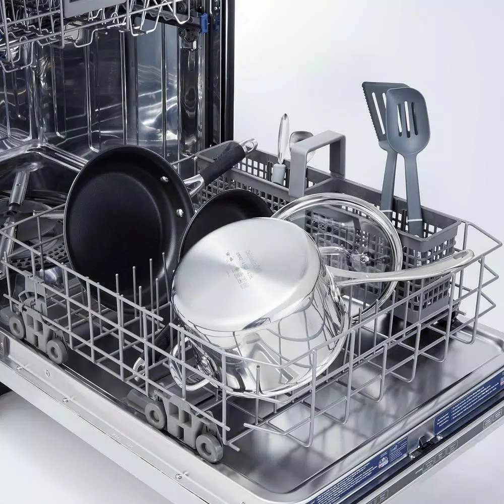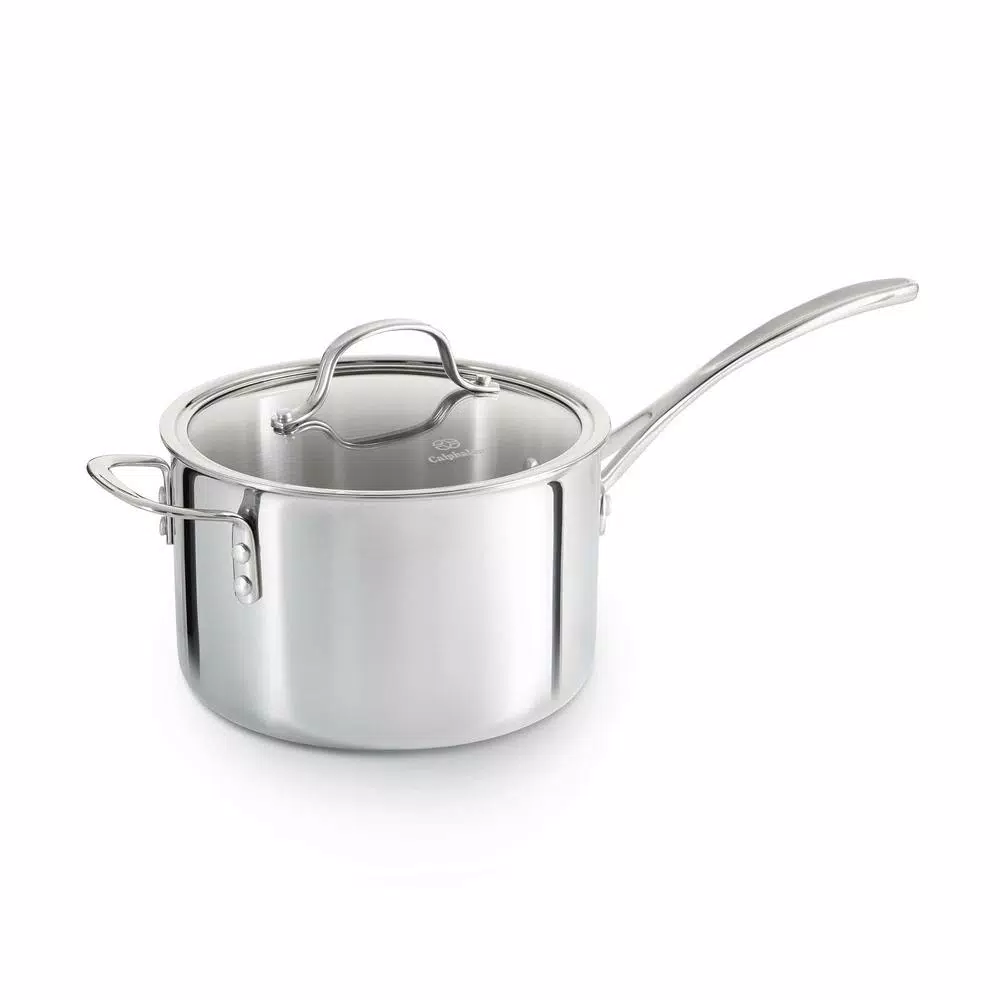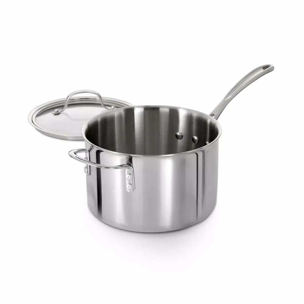 Classically styled with a polished stainless steel exterior and a satin-finished interior, the Calphalon Tri-Ply Stainless Steel 4.5 Qt. Saucepan is designed with three layers to ensure even, consistent heating. A heavy-gauge aluminum core surrounded by stainless steel provides excellent heat conduction for browning and searing, while giving you enhanced control of the cooking process. The large saucepan has the capacity to cook big batches of soups, chilies, and stocks as well as pasta, rice, and vegetables. The bottom interior is sloped for easy stirring. Includes tempered glass cover to easily view the food as it cooks.