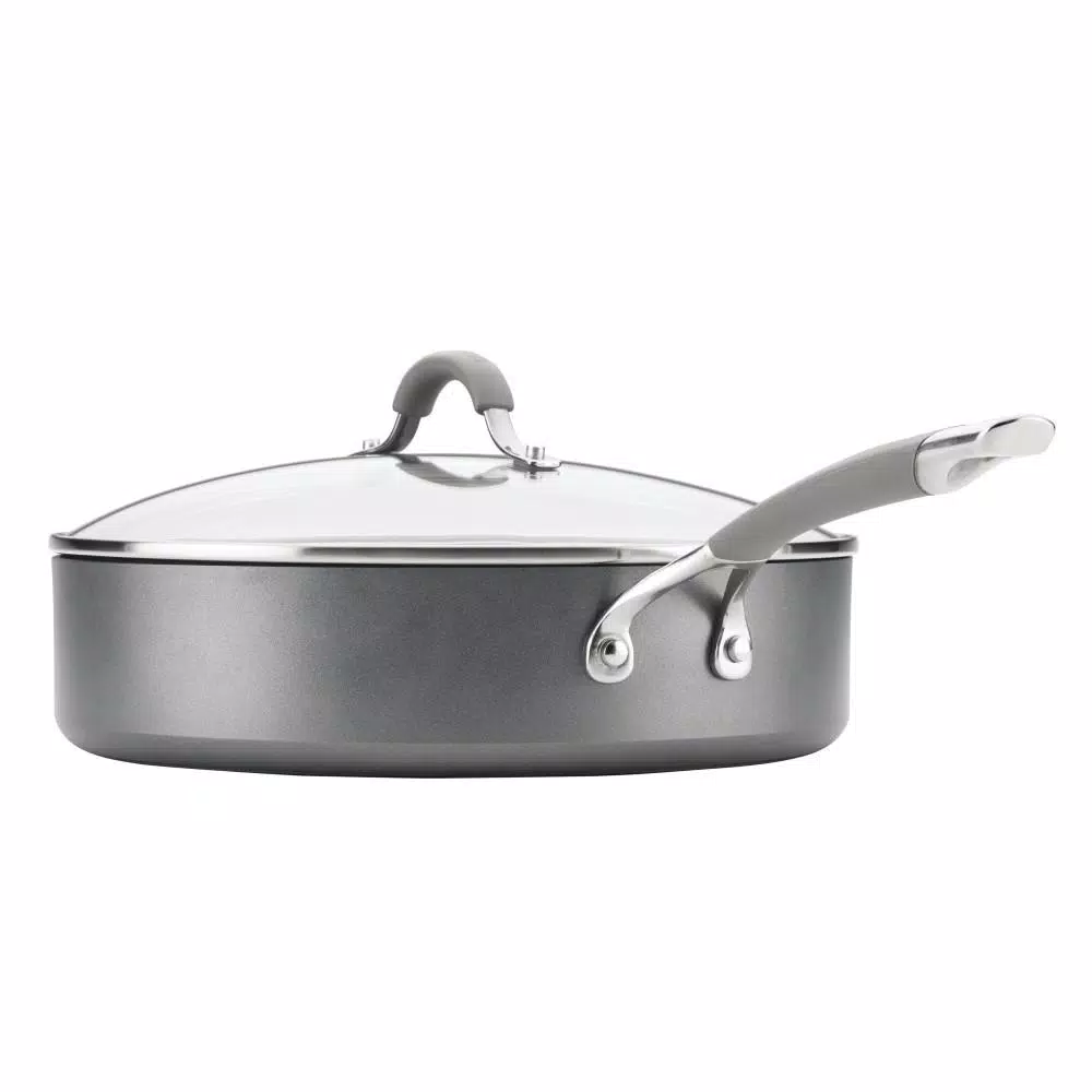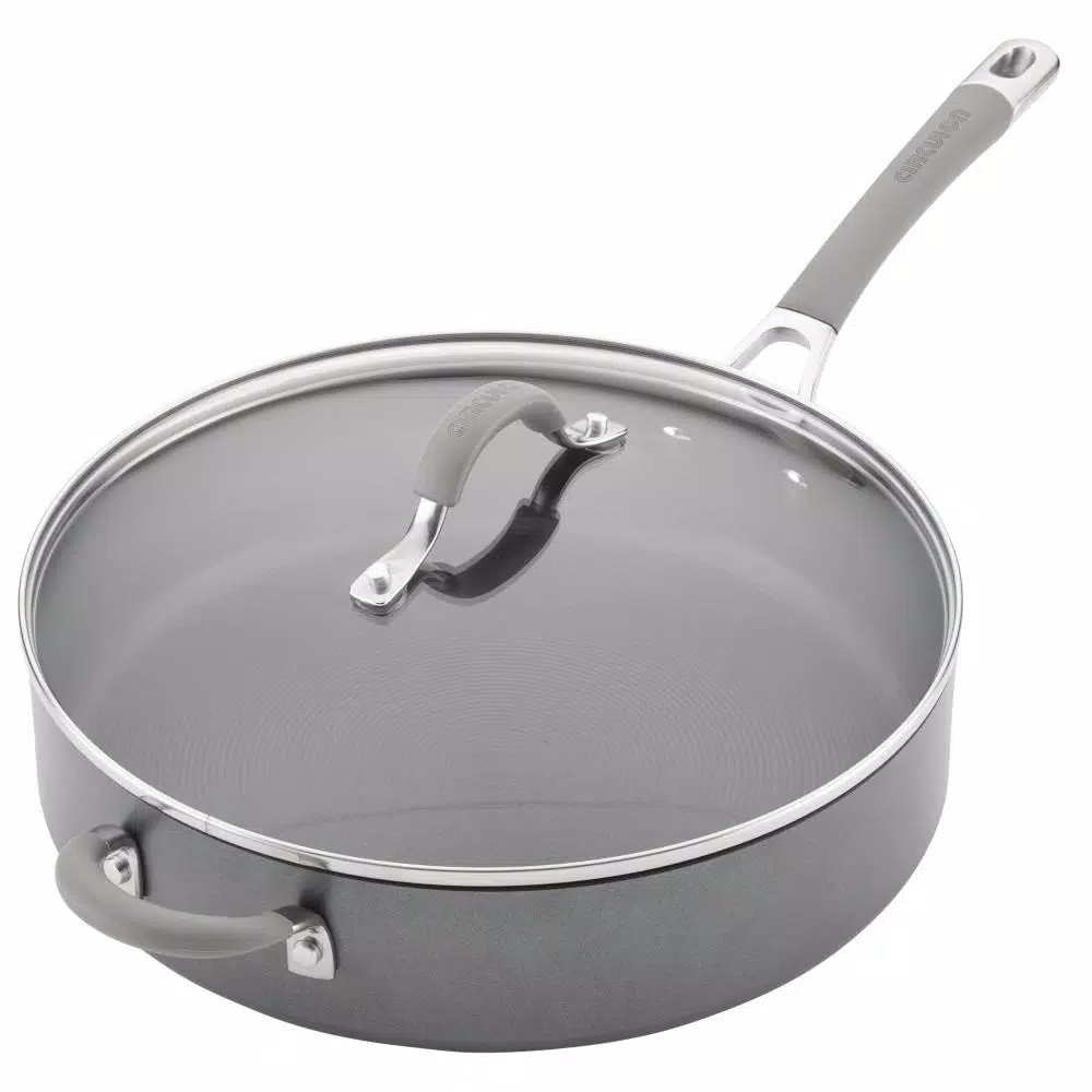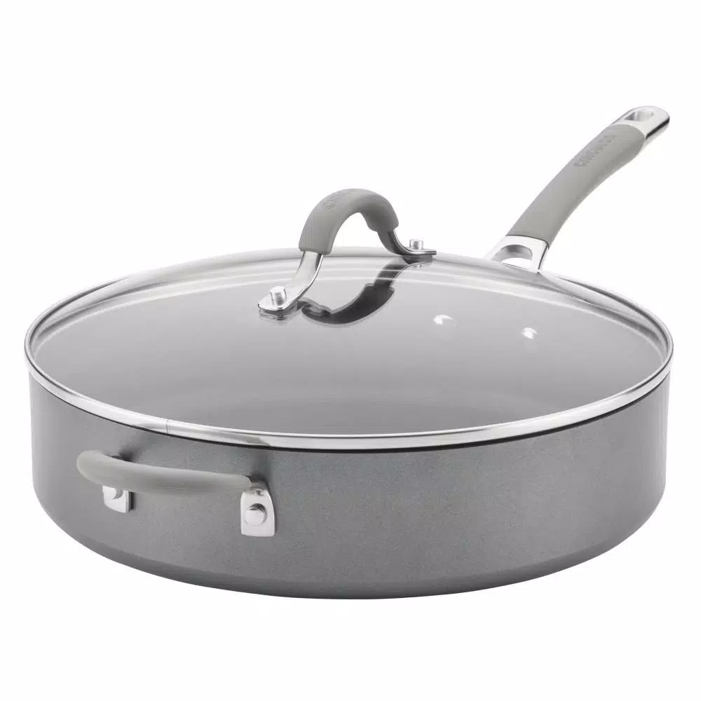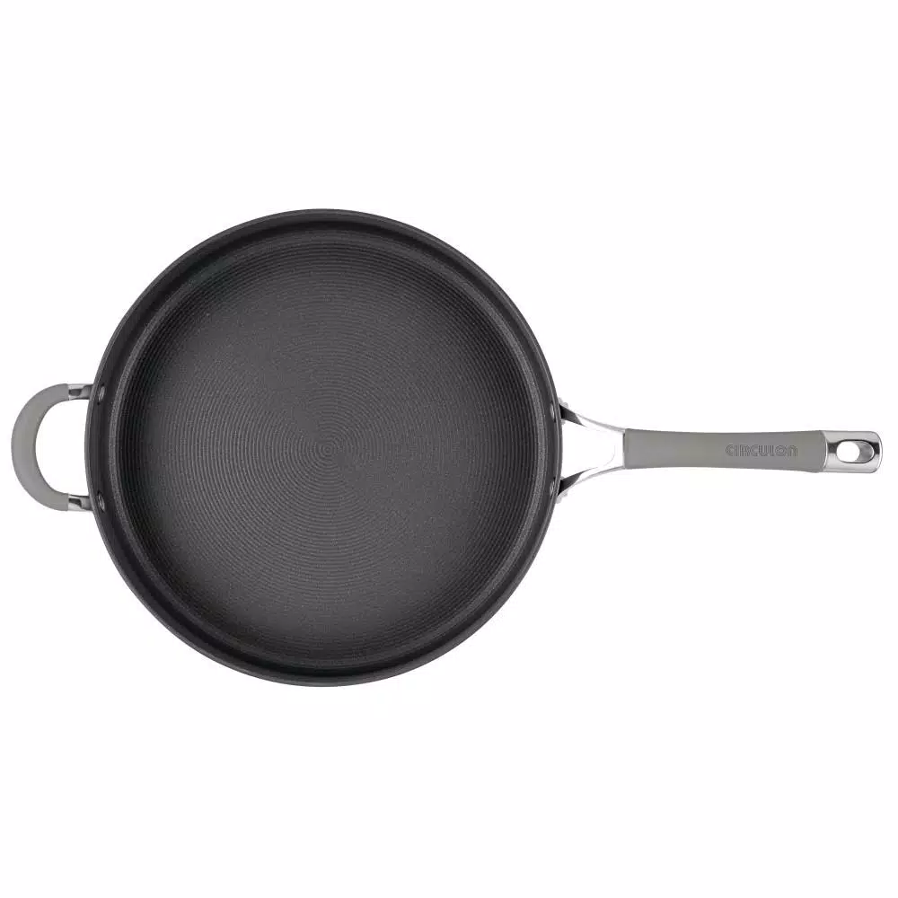For an easy one-pot solution that helps you cook smarter (and not harder) in the kitchen, choose the Circulon Elementum Hard-Anodized Nonstick 5-Quart Saut with Helper Handle. This large, versatile saut pan is crafted from super-tough, hard-anodized aluminum thatβs twice as strong as stainless steel and boasts the TOTAL Nonstick System of raised circles and triple layer, premium quality nonstick for long-lasting food release and easy cleanup. Higher pan walls transfer heat evenly and make it easy to pull together a family-sized helping of Sauted Pork Chops with Sweet Potato, Apples and Mustard Sauce. Dual riveted stainless steel handles (including an essential helper handle) feature a sleek silicone heat safe up to 400 F, and the shatter resistant glass lid seals in heat and moisture while you watch foods cook. PFOA-free, metal utensil safe nonstick inside and out comes in show-stopping oyster gray exterior color while delivering superior food release and super-easy cleanup of even the stickiest recipes like a Parmesan and Porcini Risotto. Circulon nonstick technology is so advanced, it lasts 10 times longer than ordinary nonstick. Thatβs why Circulon comes with a Hassle-Free Lifetime Guarantee.