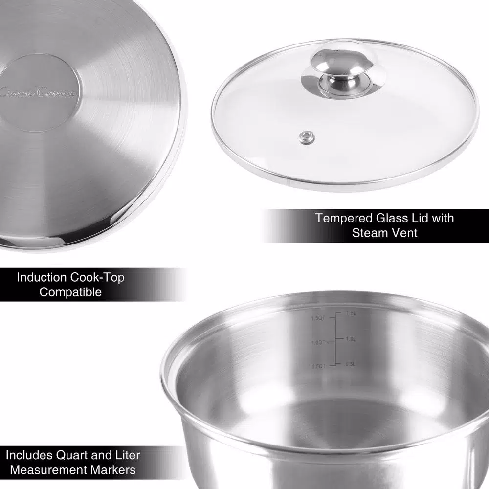 The 1.5 Qt. Stainless Steel Double Boiler Saucepan with Lid by Classic Cuisine is essential kitchen cookware for every home chef. This stainless steel 1.5 Qt. saucepan comes with a 6-cup insert for double boiling, and a tempered glass lid with vent hole to release excess moisture. This handy 2-in-1 pot is perfect for melting chocolate or cheese, candy making, preparing curds and custards, whisking eggs for a hollandaise sauce, or simply as an everyday saucepan. This double boiler and saucepan combo is durable, long lasting, and safe for glass, electric, induction or gas cooktop stoves.