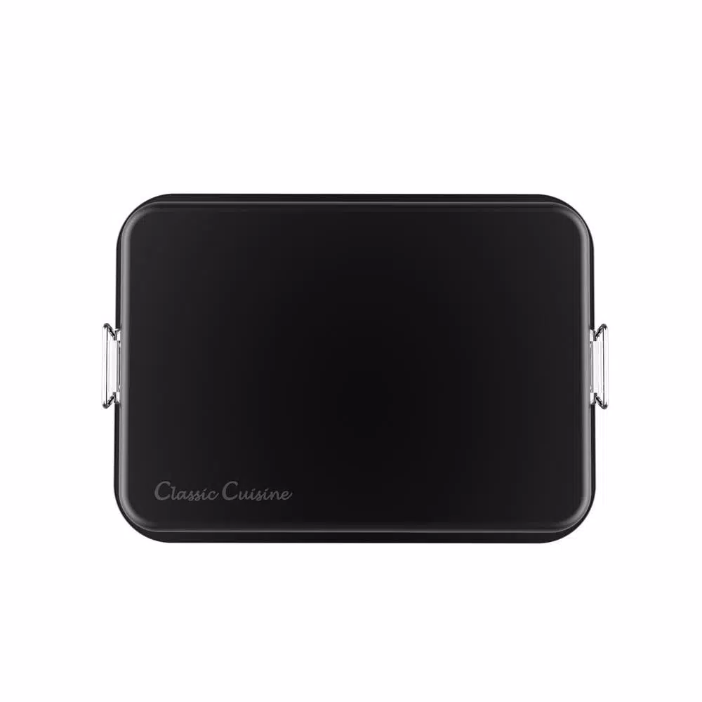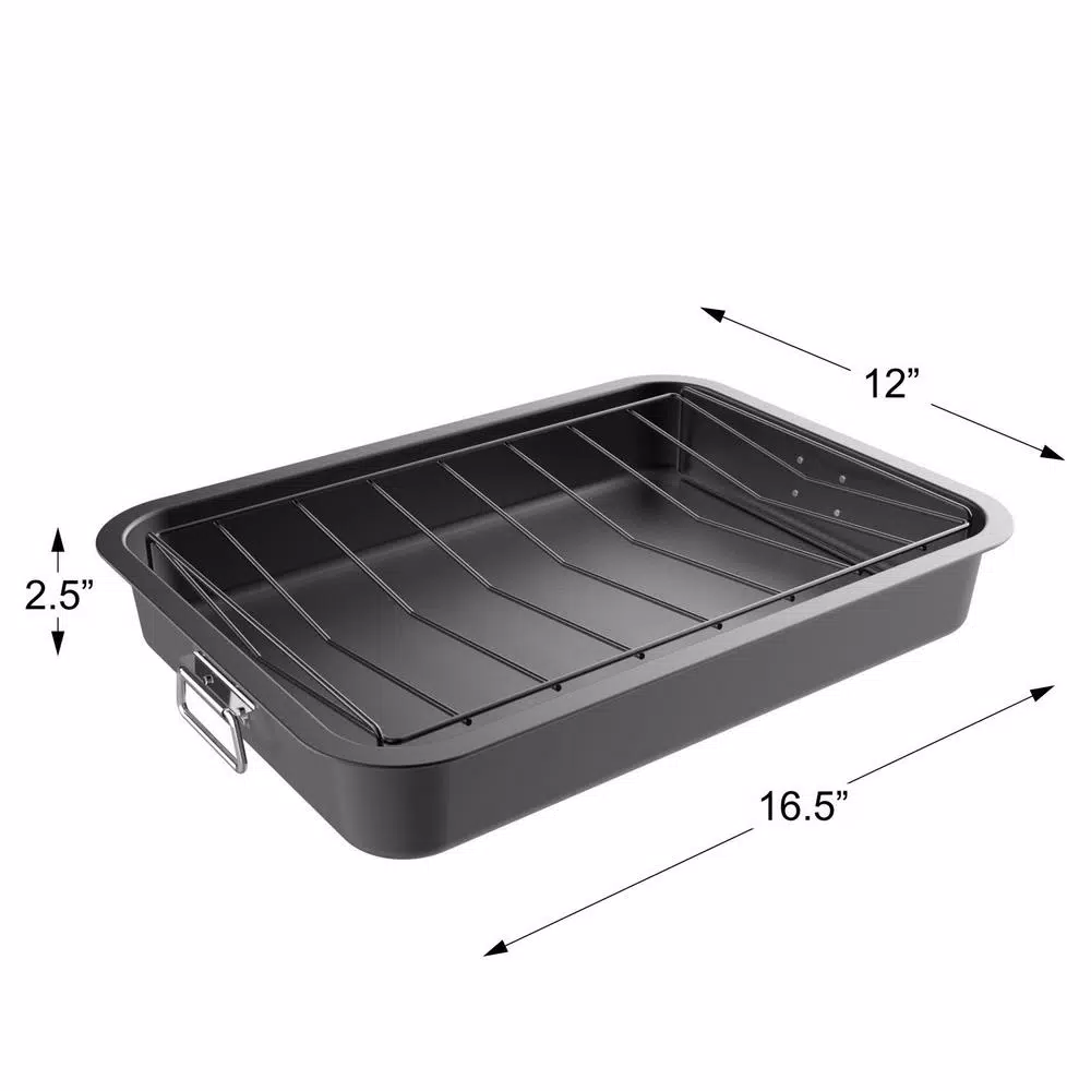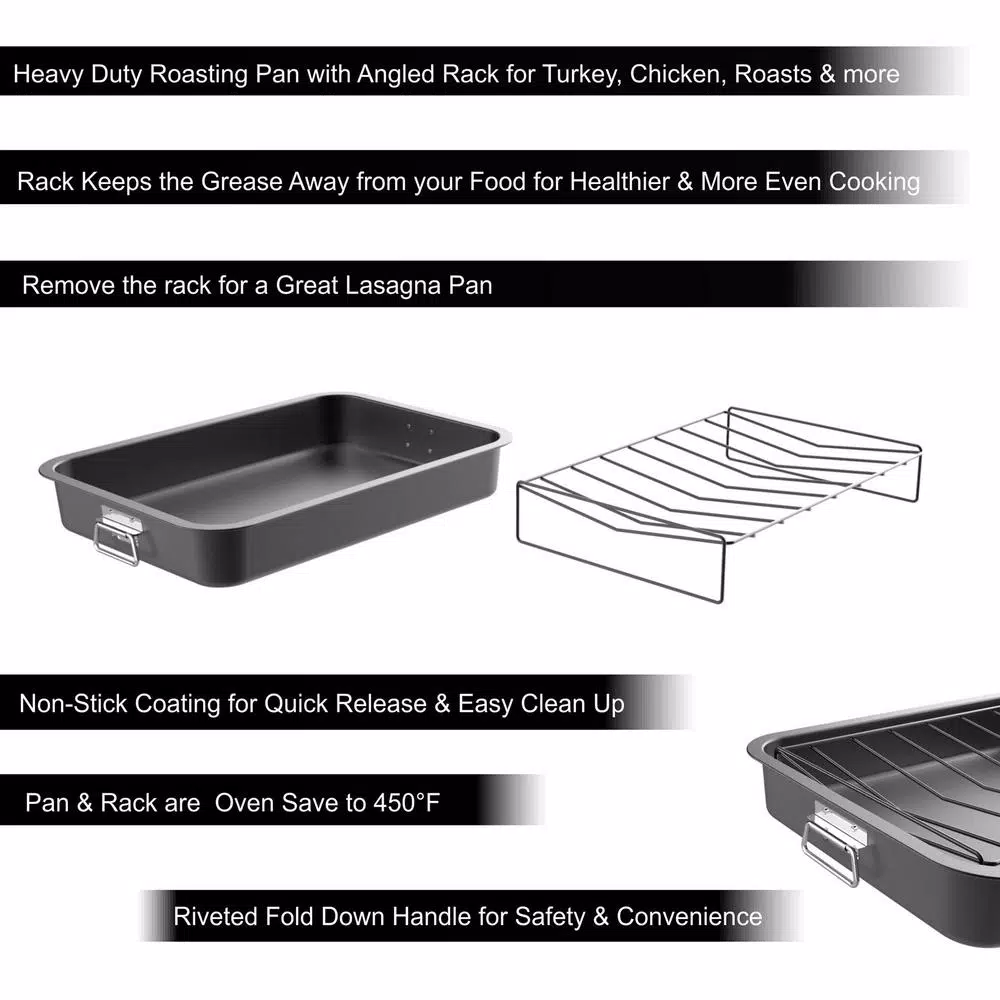 Cook up healthy and delicious dinners with the Heavy Duty Nonstick Roasting Pan with Angled Rack by Classic Cuisine. With a removable angled wire rack insert conveniently included to drain off excess fat and grease and provide better air circulation for even cooking, your roast chicken, turkey, or beef will turn out perfectly every time. This versatile pan can also be used without the rack to bake up lasagnas or casseroles. The nonstick coating on the inside and outside of the pan ensures a quick release so none of your food will get stuck to it. The convenient stainless-steel handles are securely riveted to the pan and fold down, making it safe and easy to pull the hot roaster from the oven. Made of heavy-duty Carbon Steel, this durable pan will be a long-lasting piece of cookware for your kitchen.