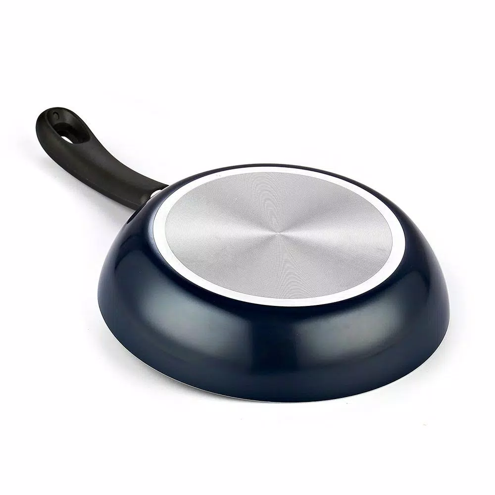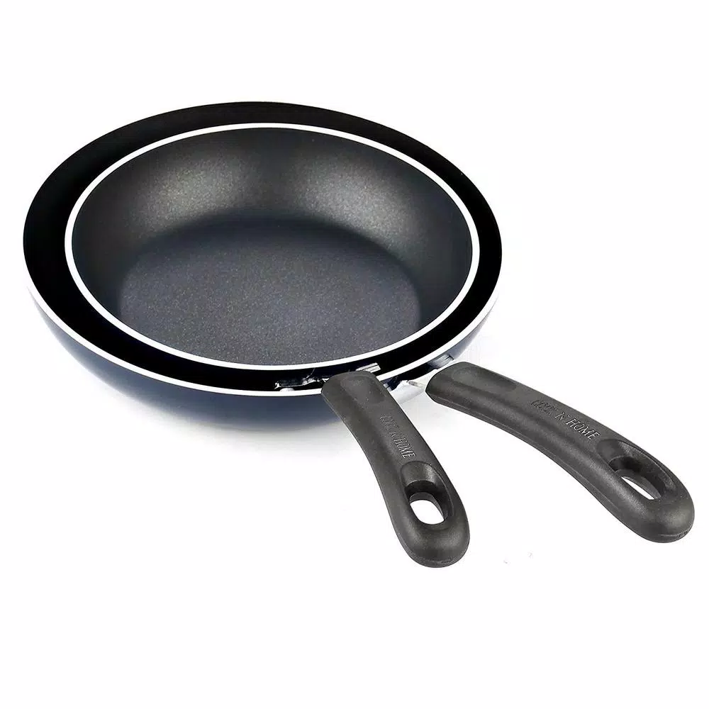 The Cook N Home 8 in. and 9.5 in. 2-Piece Nonstick Saute Pan Set in Blue includes 8 and 9.5 in. saute pans. The cookware is made of thick gauge aluminum that provides even heat conduction without hot spots. Nonstick coating that makes food release and cleaning easy. The soft touch handles stays cool when cooking. Silicone handle is oven safe to 375°F. Not for Induction cooktop. Works on: gas, electric, hot plate, halogen, glass and ceramic. Dishwasher safe.