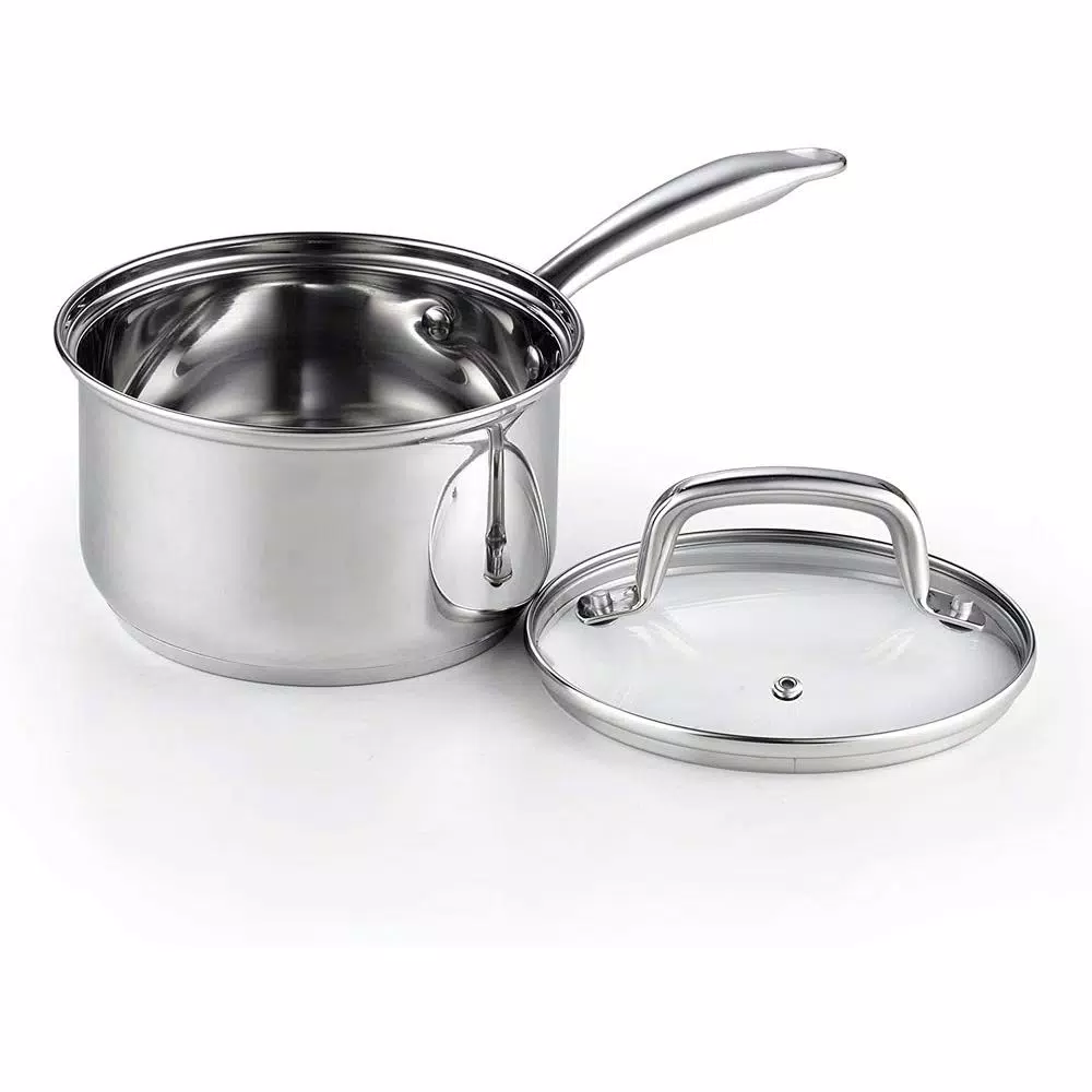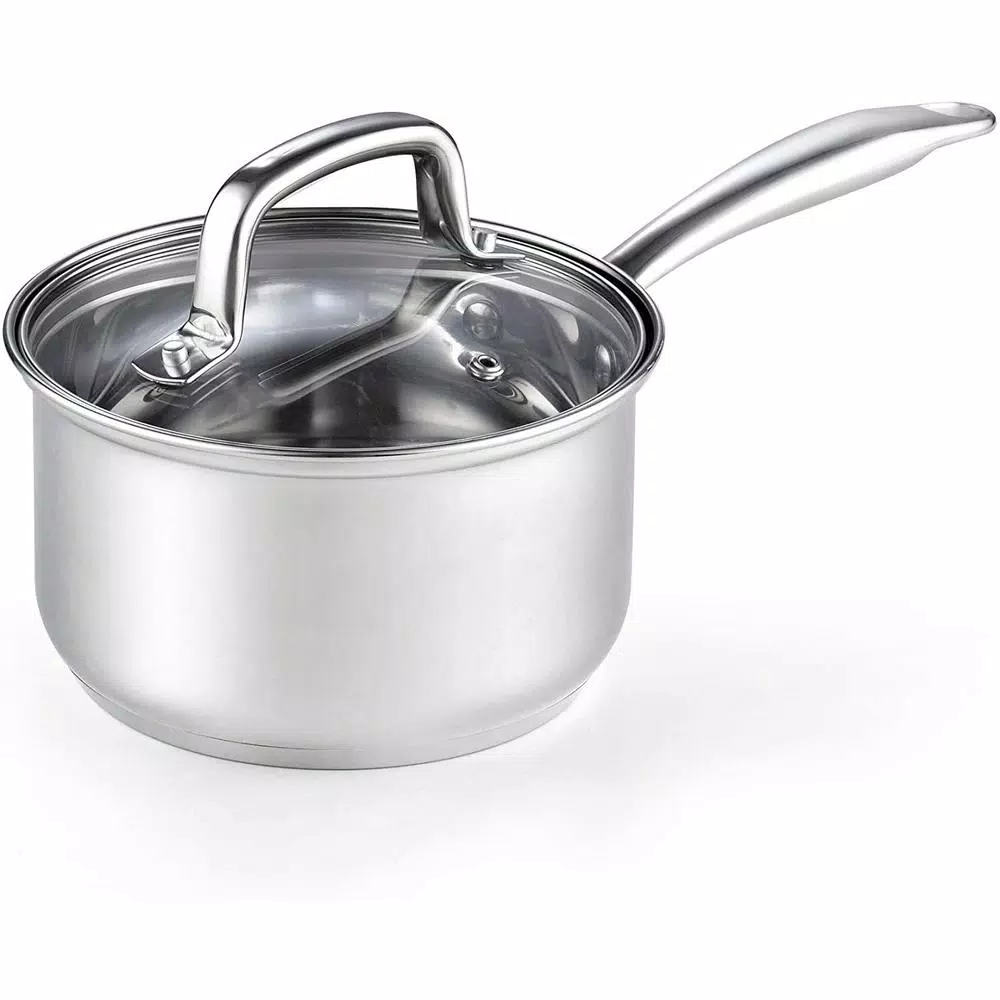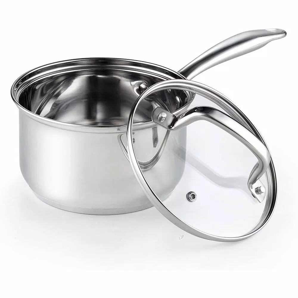The Cook N Home 2 qt. Stainless Steel Saucepan with Lid is made of mirror polished 18/10 stainless steel with an aluminum disc bottom between steel layers. The aluminum disc capsuled bottom provides even/quick heat distribution and prevents hot spots. Reflective finish inside and out for appearance and easy cleaning. Flat base and lightweight for storage and sits evenly on cooktops. Tempered glass lid with steam vent makes viewing food easy and provides an inside seal. Riveted stainless steel handles are durable, comfortable, and wide/deep for grip. Handles stay cool and have a hole for hanging. Multipurpose and holds temperature for boiling, frying, steaming, and more. Induction compatible. Works on: gas, electric, glass, ceramic, halogen, etc. Oven safe to 500F, glass lids to 350°F. Dishwasher safe.