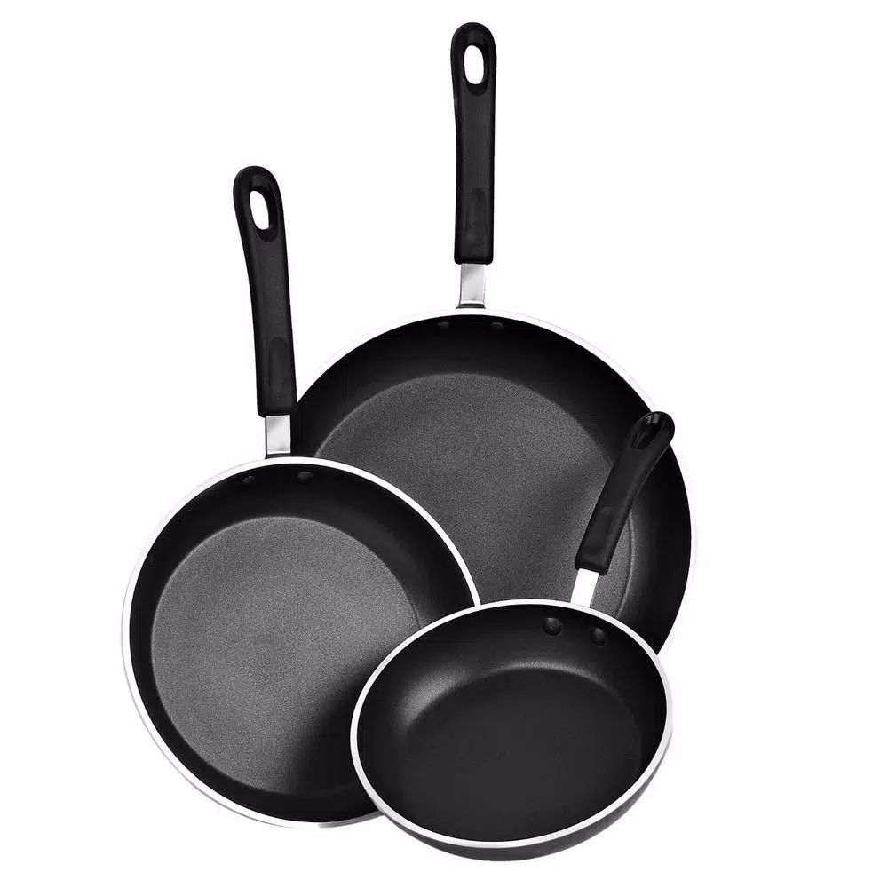 The Cook N Home 8 in., 10 in., and 12 in. 3-Piece Non-Stick Fry Pan Set in Black is made of thick gauge aluminum that provides even heat conduction and prevents hot spots. Nonstick coating makes cleaning easy and is cadmium and lead free. Bottom is compatible with induction stoves. Soft handles are comfortable and stay cool while cooking. Dishwasher safe, oven safe to 350F, and can be used on all types of stovetops. Please do not use metal utensils as it may scratch the nonstick coating. Over-heating may damage nonstick coating. Putting a hot pan in cold water may reduce nonstick coating life span. See further details in use and care manual.