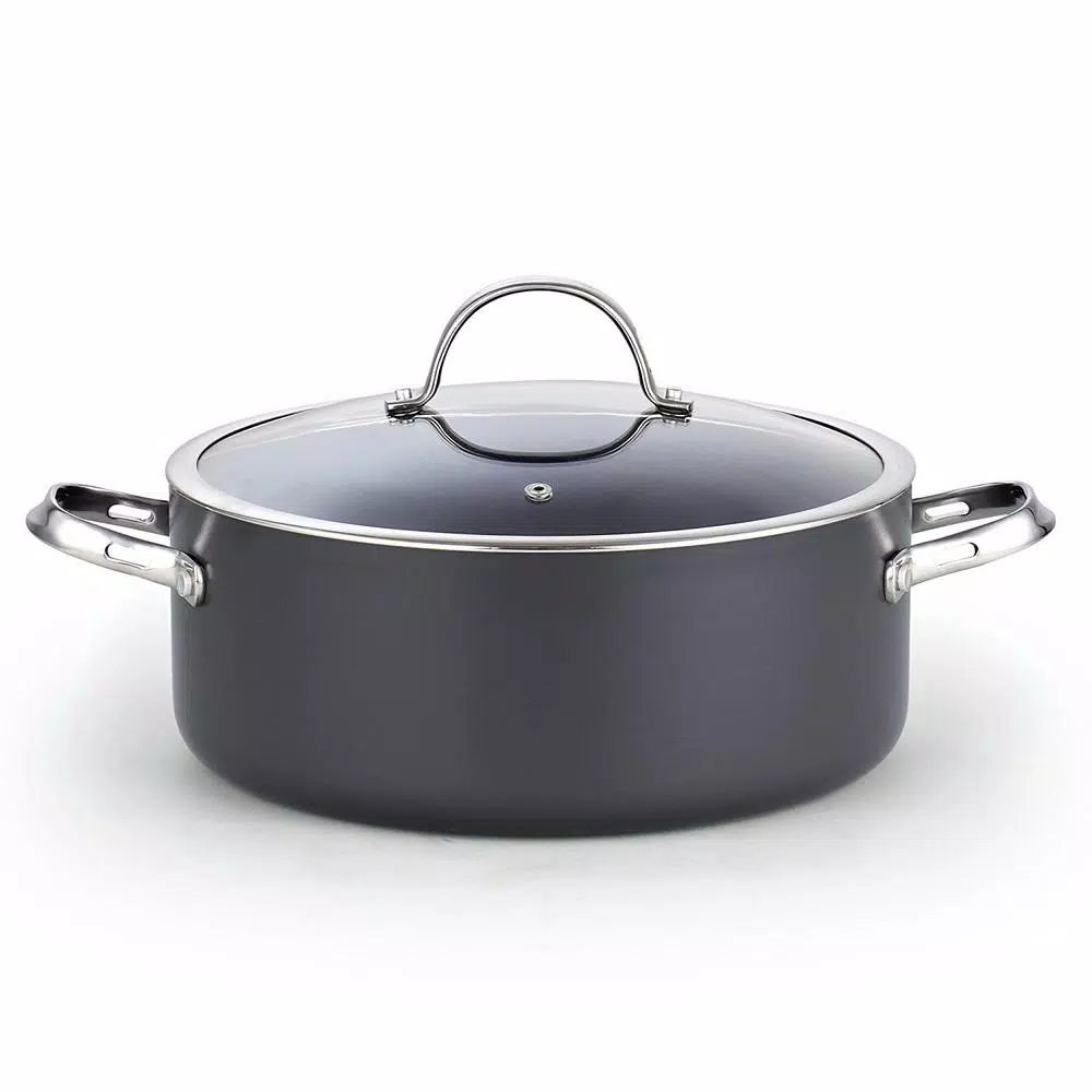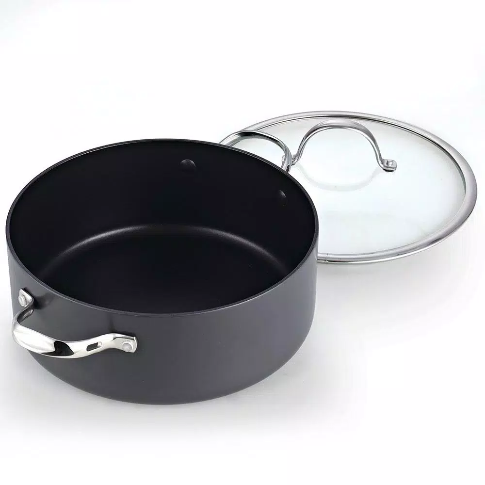 The Cooks Standard 7 Qt. Nonstick Hard Anodized Dutch Oven Casserole Stockpot with Lid has a hard-anodized surface that is durable and harder than stainless steel. The heavy gauge aluminum core provides even heat distribution and prevents hot spots. Nonstick delivers exceptional performance and makes food release/cleaning easy. Lid is tempered glass with a steam vent that is protected by a stainless steel rim. Stainless steel handle is riveted for strength and is comfortable to hold. Large size for multipurpose function. Not Induction compatible. Works on gas, electric, glass, halogen, ceramic, etc. Oven safe to 500Β°F, glass lid to 350Β°F. Dishwasher safe, hand wash recommended. Measures: 16 in. by 11 in. by 4.5 in., 6 lb.