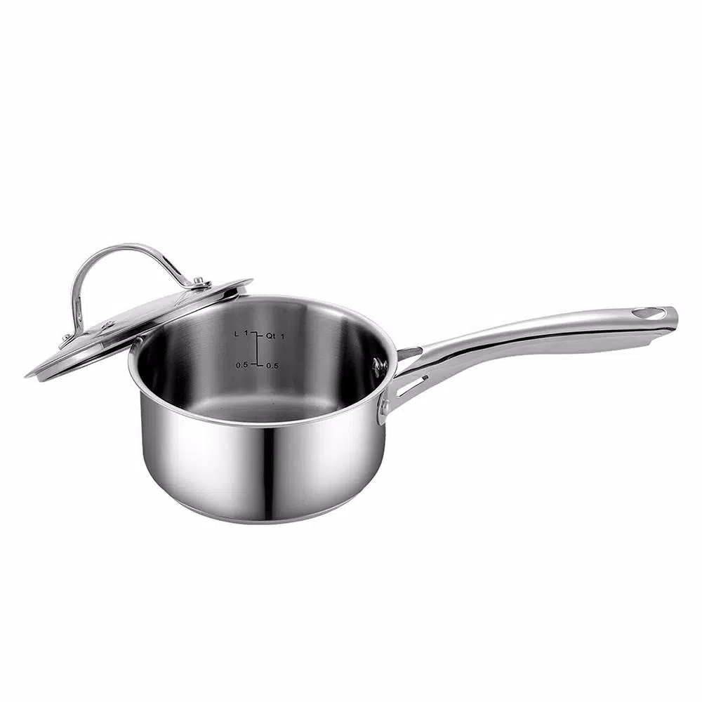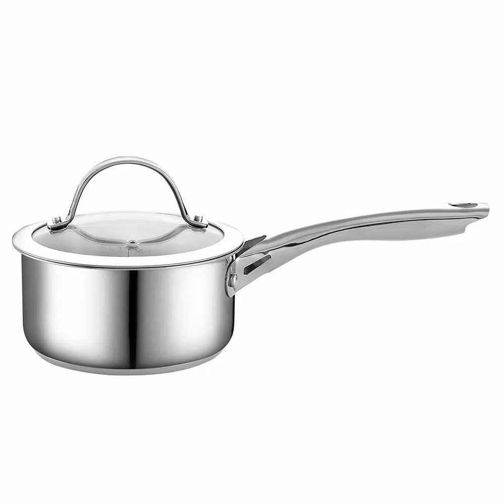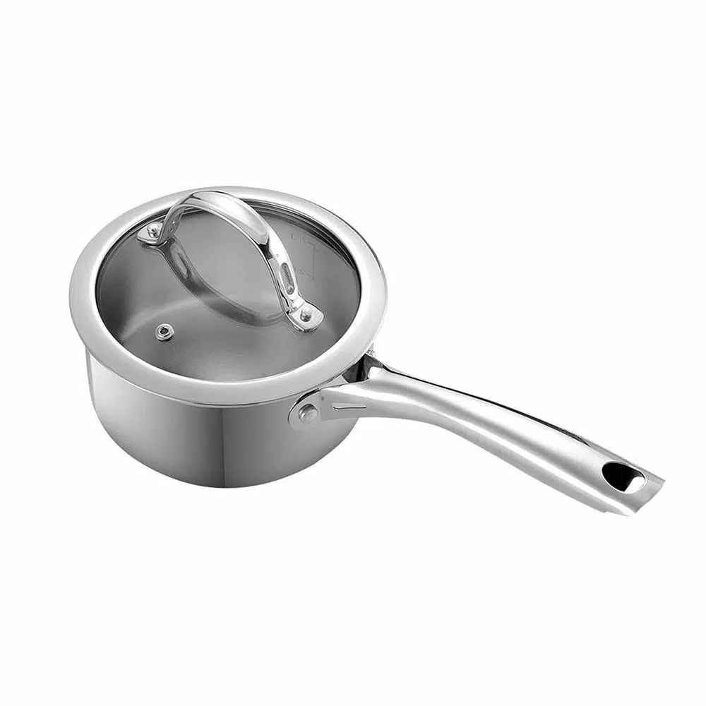 The Cooks Standard 1.5 Qt. Stainless Steel Saucepan with Lid is made with 18/10 stainless steel with a middle aluminum layer in the bottom of the cookware. Aluminum disc layered in the bottom allows for even heat distribution and prevents hot spots. Tempered glass lid with steam vent to view food and seals in moisture. Riveted handles for durability, stays cool/comfortable while cooking, and is hang able. Induction compatible. Works on: gas, electric, glass, ceramic, halogen, etc. Oven safe to 500Β°F, glass lid to 350F. Dishwasher safe.