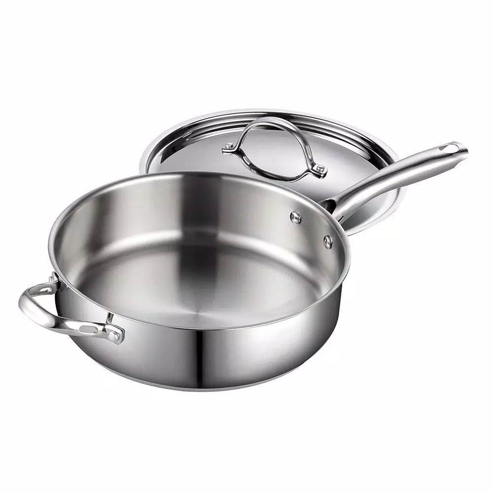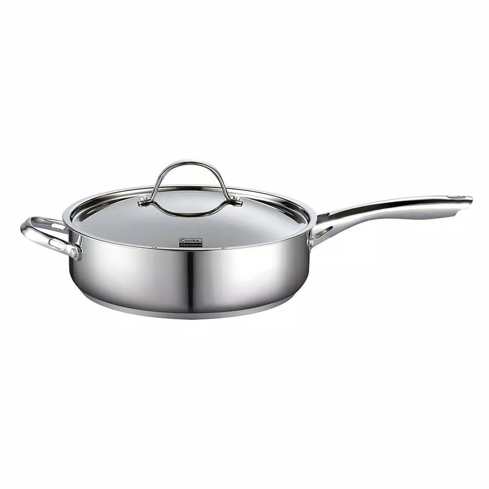 The Cooks Standard 5 Qt. Stainless Steel Saute Pan with Lid is made with stainless steel with an aluminum disc layered in the bottom. The aluminum disc provides even heat distribution and prevents hot spots. Stainless steel lid keeps in heat and moisture, oven safe to 500ยฐF. Handles are attached to the cookware with 2 rivets that offers durability. Cookware is suitable with gas, electric, ceramic, glass and induction stoves. Dishwasher safe.