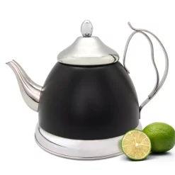 This stainless steel tea kettle is crafted of high quality heavy gauge stainless steel with 1.0 qt. capacity. High quality stainless steel body with Filter Black Color finish. Includes a removable stainless steel tea infuser basket. Kettle heats up quickly and retains heat well. Aluminum capsulated bottom provides even heat distribution.