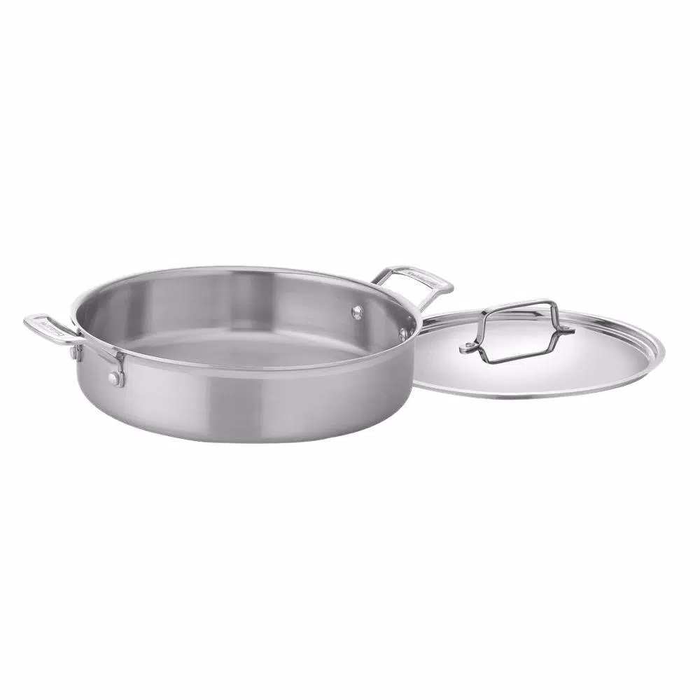 The Cuisinart MCP55-30 5.5 Qt. MultiClad Pro Casserole with Cover is one of the most versatile pieces of cookware allowing the ultimate convenience. This beautiful brushed stainless triply pan closely resembles the saute pan, but is designed with two large stainless steel loop grips, riveted securely into place and big enough to ensure comfortable handling and excellent balance. Straight sides maximize capacity, making it ideal for preparing family sized portions of sauces, stews and paellas. With its mirror-finish, solid stainless steel lid, the casserole moves effortlessly from stovetop saute, to oven casserole, to elegant covered server at the dinner table.