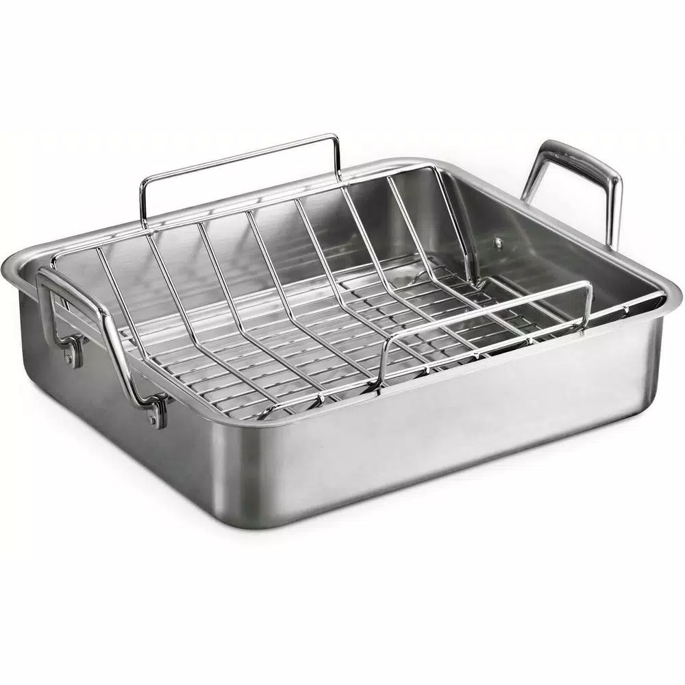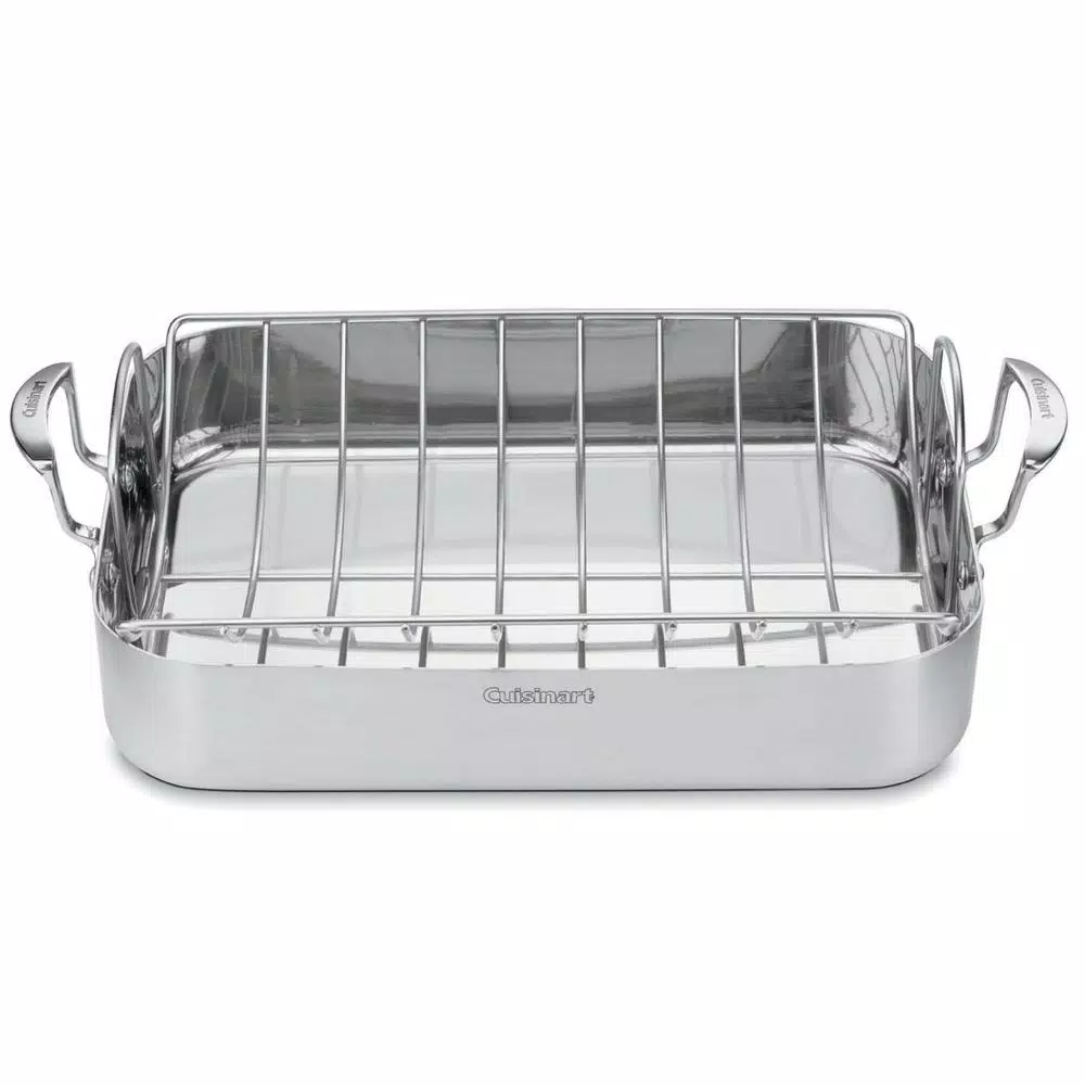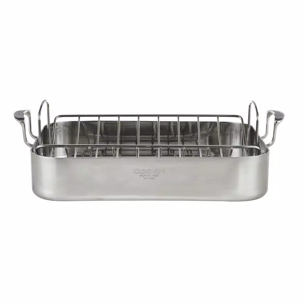 The Cuisinart MCP117-16BR MultiClad Pro Stainless 16 in. Rectangular Roasting Pan with Rack is an essential piece of cookware for family dinners, parties and holiday celebrations, designed to hold turkeys, chickens, and large roasts. The pure aluminum core bonded to the brushed, stainless steel exteriors and stainless steel interiors includes Heat Surround Technology and is induction ready and dishwasher safe. Cool Grip, riveted stainless steel handles make placing the roasters into the oven, and lifting them out, safe and hassle free. Solid stainless steel racks allow heat to circulate and let meat or poultry drain as it cooks.