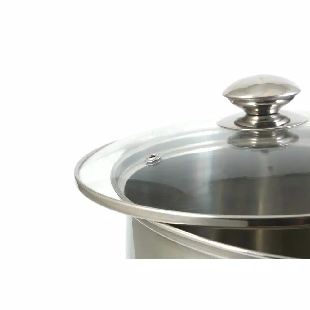 Constructed in stainless steel for durability and encapsulated base enhances faster and even heat distribution. Tempered vented glass lid allows you to monitor cooking. Also features mirror polished exterior with stay cool riveted handles.