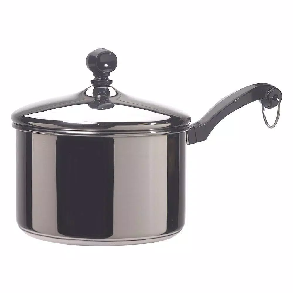 This Farberware Classic Series 2-Quart Stainless Steel Saucepan with Lid is sure to come in handy at all times of the day or night. Farberware has been trusted for over 100 years, and this saucepan continues that tradition for a new generation. A full cap base featuring a thick aluminum core surrounded by stainless steel provides rapid, even heating, perfect when cooking oatmeal or poaching an egg or two at breakfast. The heavy-duty stainless steel is polished to a mirror finish for a classic touch, and the comfortable saucepan handle with iconic styling provides a confident grasp. This 2-quart saucepan works beautifully when reheating a serving of macaroni and cheese at lunch, cooking a side of rice during dinner, or warming chocolate sauce to top off an ice cream sundae for dessert. A self-basting lid helps seal in heat and flavor and the saucepan is dishwasher safe and oven safe to 350Β°F, making it a perfect complement to the rest of the Farberware collections. Rely on the versatile, dependable Farberware Classic Series 2-Quart Stainless Steel Saucepan with Lid for everything from reheating leftovers to helping make dessert.β