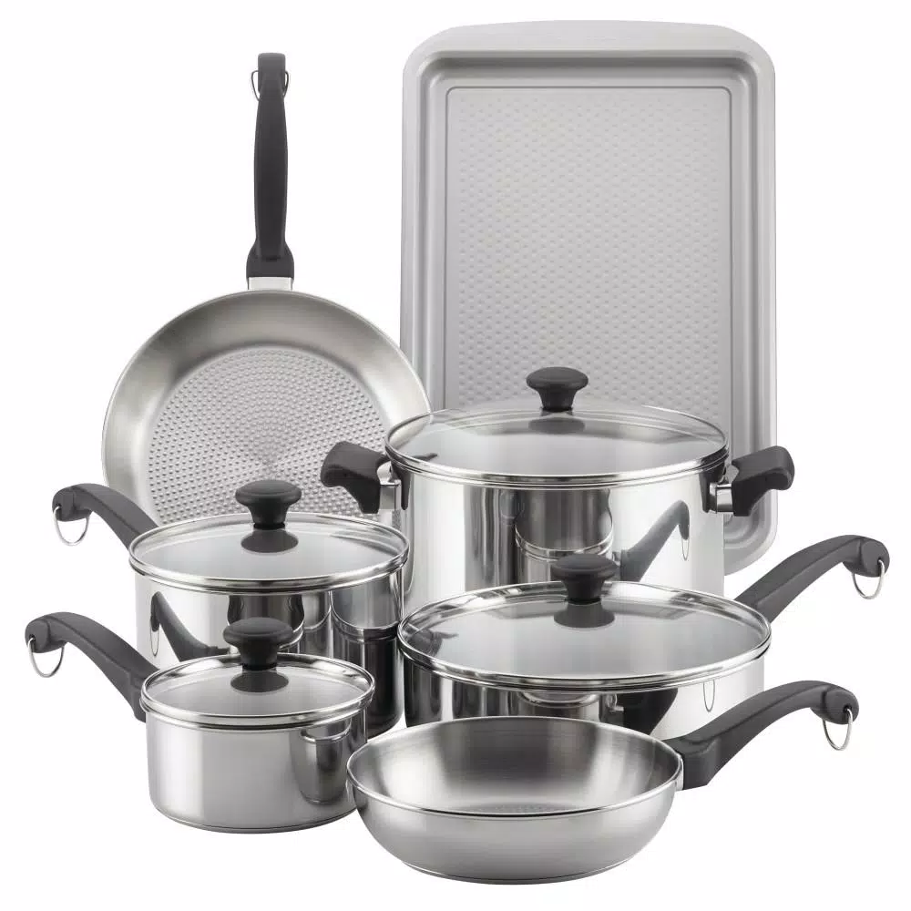 Timeless tradition meets cutting edge technology in the Farberware Classic Traditions 12-Piece Stainless Steel Cookware Set. This collection of cookware essentials features traditional bell-shaped profiles with mirror-polished stainless steel exteriors to deliver a radiant touch of kitchen style, and the frying pans and sautΓ© pan boast the innovative ProSear Technology embossed surface for superior searing, enhanced browning, and easy food release. A full cap base ensures fast, even heating and is suitable for all stovetops, including induction. The entire cookware set is oven safe to 350Β°F, and bakers of gooey double fudge cookies or panko-encrusted mozzarella sticks will love the cookie panβs SmartGlide nonstick system, a revolutionary dimpled surface that creates air pockets to transfer heat to food quickly and evenly for superior browning. Shatter-resistant glass lids provide a handy window on all the delicious cooking while sealing in heat and moisture, and the complete set is dishwasher-safe for effortless cleanup. This cookware boasts all the essentials for making memorable meals, including a 1-Quart Saucepan with Lid, 3-Quart Saucepan with Lid, 6-Quart Stockpot with Lid, 8.25-Inch Frying Pan, 9.75-Inch Frying Pan, 3-Quart SautΓ© Pan with Lid, 10-Inch x 15-Inch Cookie Pan, and a Prestige Nylon Slotted Spoon. For classic style with innovative cookware technology, get set with a full 12-Piece set of Farberware Classic Traditions Stainless Steel Cookware.