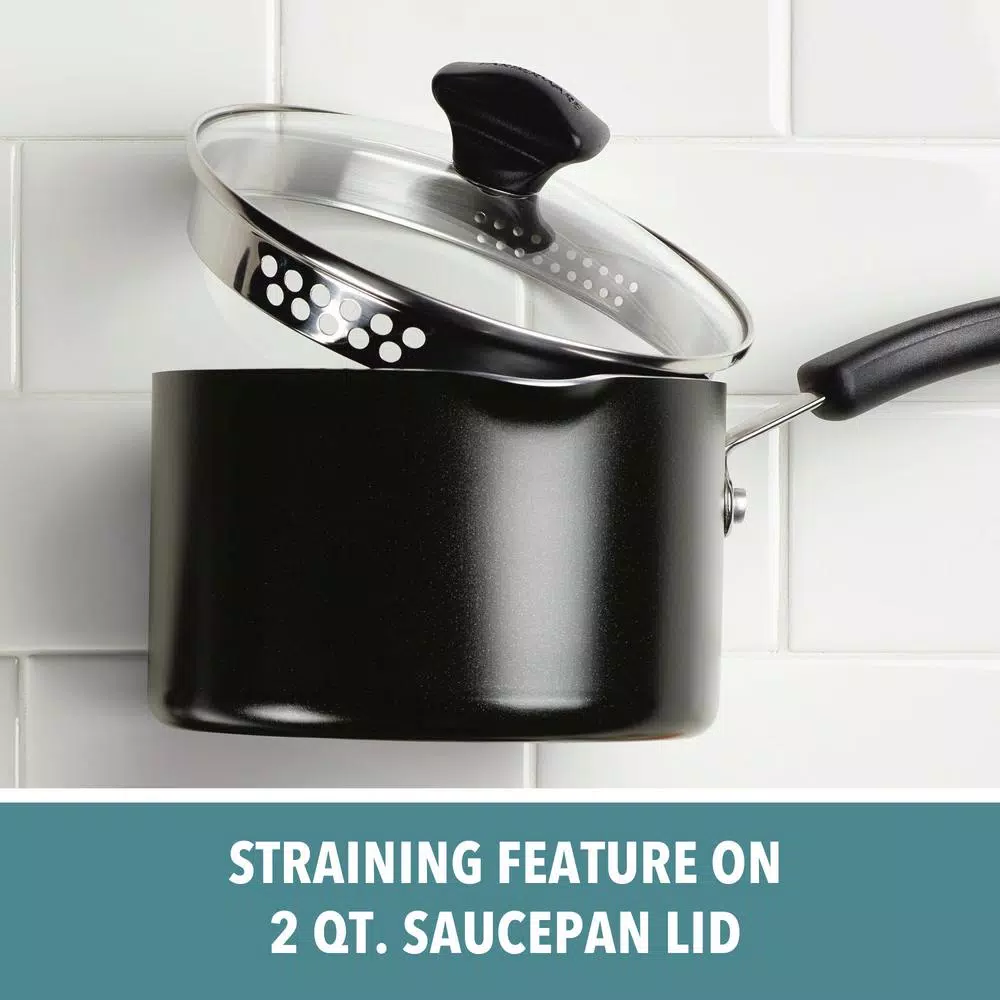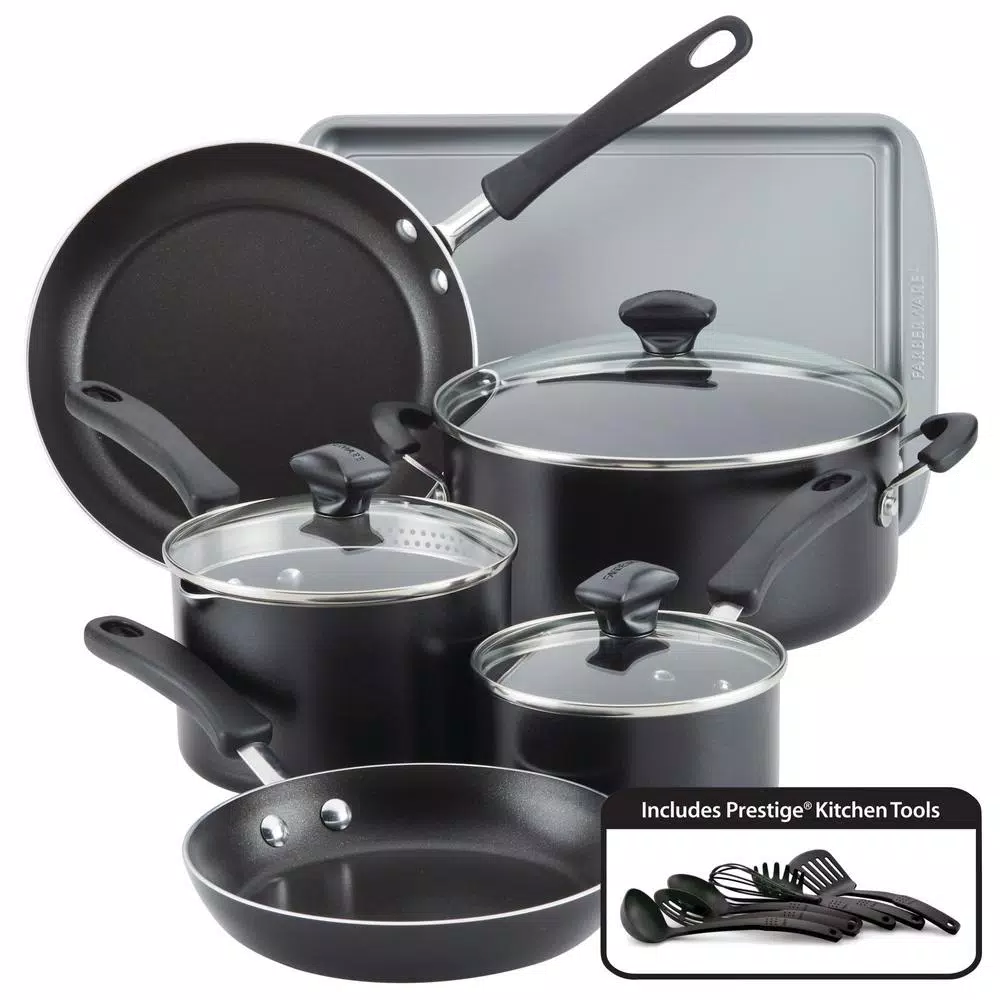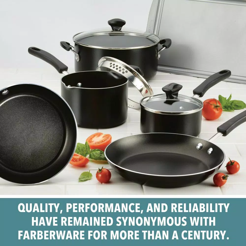 Equip the kitchen for convenience and reliability to make great family meals with the Farberware Cookstart 15-Piece DiamondMax Nonstick Cookware Set. Farberware has brought performance, convenience and reliability to countless kitchens for over 100-years, and this set continues that tradition for a new generation. Crafted from heavy-duty aluminum for excellent heat distribution, this nonstick cookware boasts modern exteriors and superior DiamondMax nonstick interiors that perform 3X-better than ceramic nonstick for easy food release and cleanup with a distinctive look. Use the saucepans for warming soups and sauces, the skillets for browning ground beef or pork chops, and the cookie pan for roasting chicken nuggets or baking up a batch of chocolate chunk cookies. The pots and pans are oven safe to 350Β°F and feature comfortable handles for a confident grip. Shatter-resistant glass lids allow cooking to be monitored without losing heat or moisture, and the set includes six handy Prestige nylon kitchen tools to get delicious dishes started right away. Plus, the entire set is dishwasher safe for quick, convenient cleanup. Be ready to create breakfast, lunch, and dinner every day with the convenient, essential pieces in the Farberware Cookstart 15-Piece DiamondMax Nonstick Cookware Set.