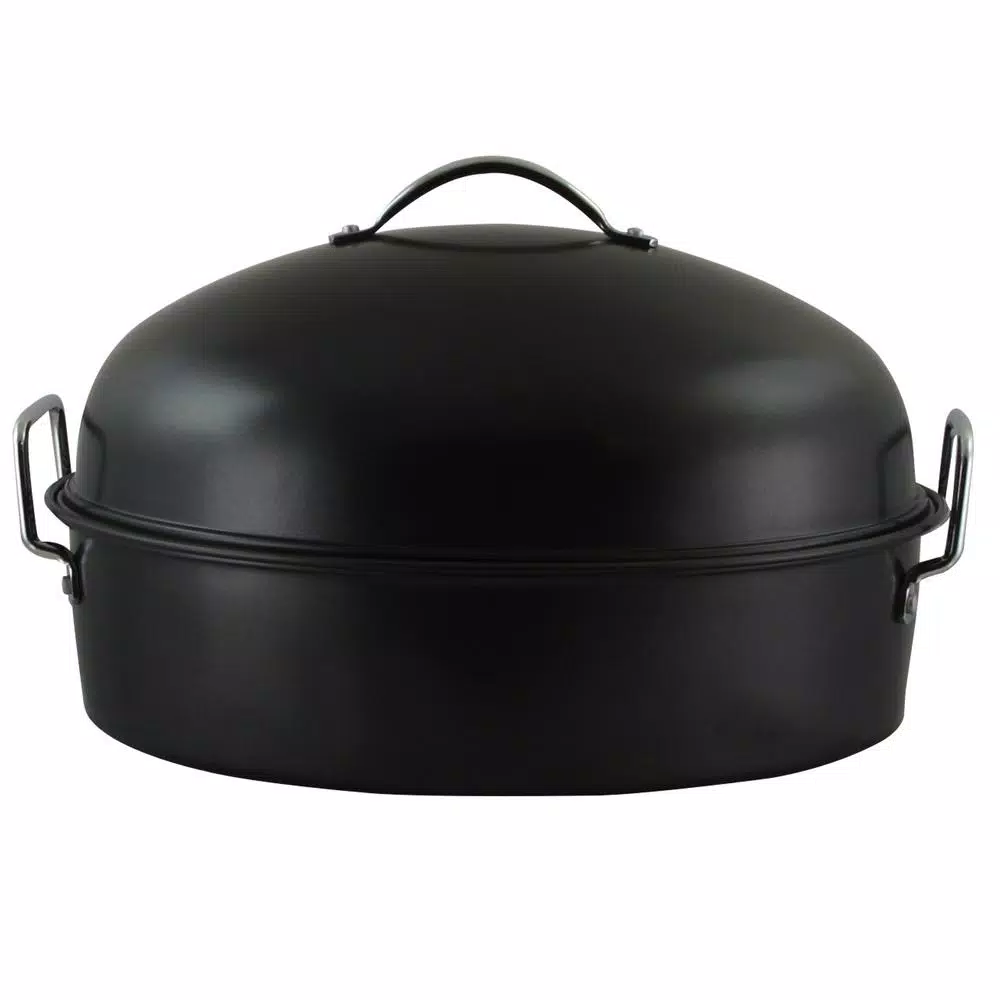 Make the perfect roast with this Kenmar 16 in. Carbon Steel Roaster Pan With High Dome Lid from Gibson Home. This carbon steel roasting pan features even heat distribution and a high dome lid to embrace the contours of your favorite meats, as well as 2-convenient riveted carrying steel handles. This roasting pan conveniently comes with a wire rack for added versatility.