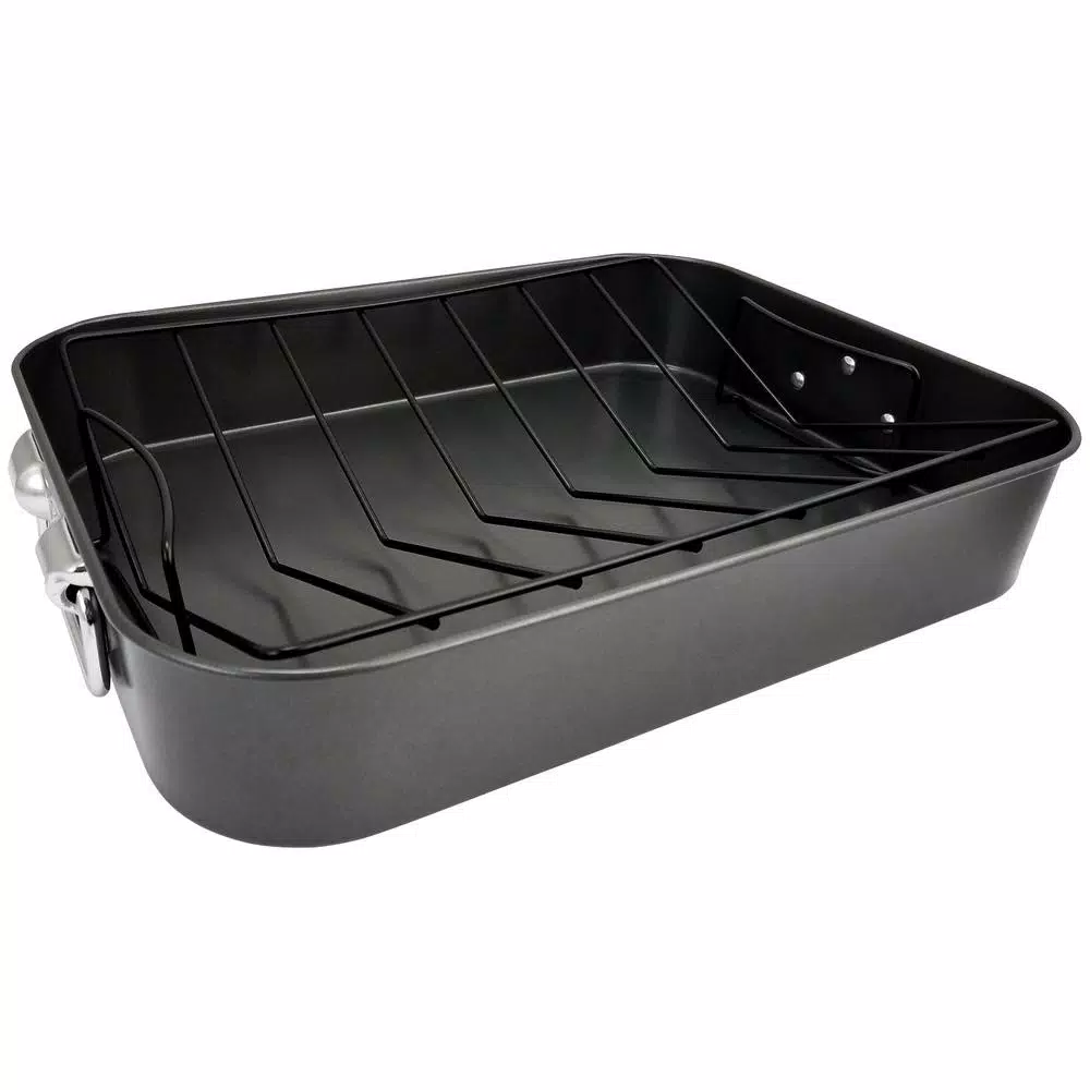 Gibson Homeβs Top Roast Non-Stick Roaster includes a 16 in. x 12 in. x 3 in. Roaster and a metal rack. Silver Handles provide an easy grip and roaster is presented in a handsome silver color. Carbon steel construction is strong and durable. Non-stick interior is perfect for low-fat cooking and is easy to clean. Hand wash is recommended. A great value for an appealing and convenient roasting pan.