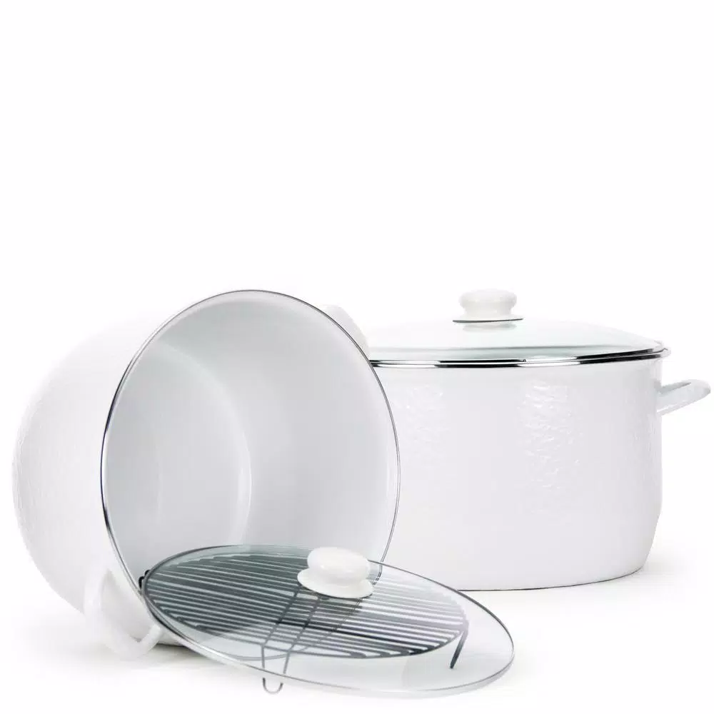 18 qt Stock Pot with rack, 8 in deep x 13 inch wide interior with glass lid This enamelware is made of carbon steel coated with a porcelain enamel and trimmed in stainless steel. There will be variations in the shading of colors and pattern formations which are the results of the hand-dipped process.