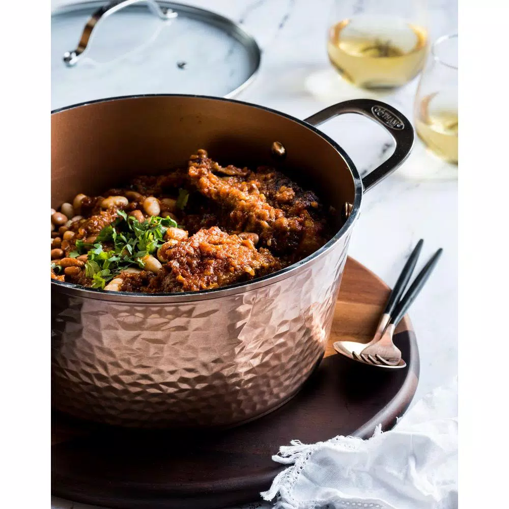 Designed in Italy, this Gotham Steel cookware set marries the traditional beauty of hammered copper with the latest in non-stick advances. Aluminum construction, triple-coated with our proprietary Ti-Cerama surface produces even heat for simmering risotto and sauces, pan-frying or slow-braising meats and stews. It is PTFE and PFOA free which means nothing will stick. Cooking without butter or oil. Gotham Steel will change the way you cook and clean. The Ti-Ceramic coating allows for easy clean up and dishwasher safe.
