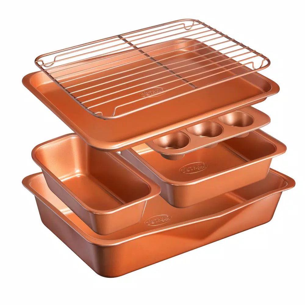 - Set includes: 8 in. fry pan, 10 in. fry pan with tempered glass lid, 2.75 qt. sauce pan with tempered glass lid, 3.5 qt. sauce pan with tempered glass lid, 3.75 qt. stock pot with tempered glass lid, 5.35 qt. stock pot with tempered glass lid, cookie sheet, loaf pan, square baking pan, large baking pan with rack and muffin pan