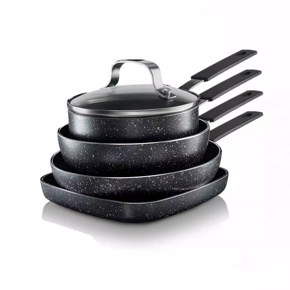 - Set includes: 6.5 in. fry pan, 6.18 in. square fry pan, 0.75 Qt. sauce pan with glass lid, and 5.75 in. wok