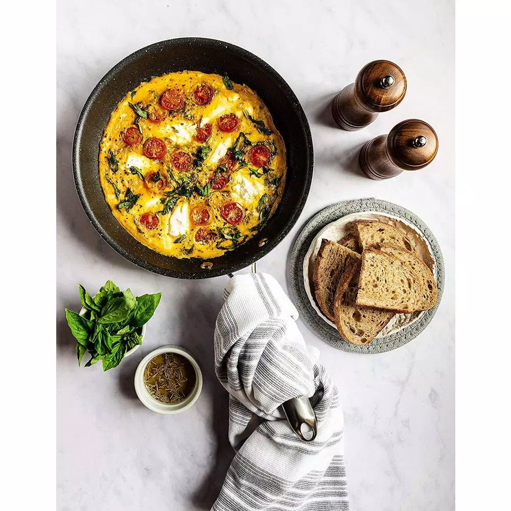 Pioneering GRANITESTONE cookware features a mineral-infused granite coating that is the perfect blend of nonstick durability and ease of use The GRANITESTONE cookware is pressed from a single sheet of aluminum and layered 3-times with our proprietary coating for the ultimate nonstick experience which requires no oil making healthy cooking easy. The extra thick coating is super durable and is scratch resistant and metal utensil safe The panโs sleek and modern speckled exterior with neutral tones will match any kitchen decor. Cleanup is a breeze too and the pans will look new even after years of use.