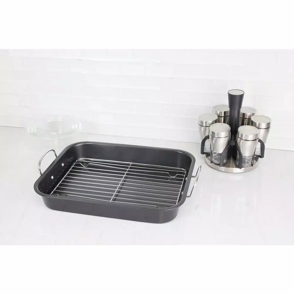 Whether you’ll be throwing large dinner party for your loved ones during the holidays or searing chicken for your summer barbeque, this convenient roast pan with an included grill rack will be a valuable investment. The pan comes complete with a flat rack which lets you prop up everything from rib roasts, whole fish, pork shoulder and more. It is sized at 15 in. to accomodate a full 12 lb. roast and 9 lb. poultry. With a stainless steel construction that distributes heat evenly, it ensures vegetables are roasted evenly and are carmelized all over, chicken is crisp and consistently golden, and roasts are tender and juicy. Equipped with riveted stainless steel handles, transfering in and out of the oven is safe and easy. Complete with a non-stick coating, clean up is a breeze