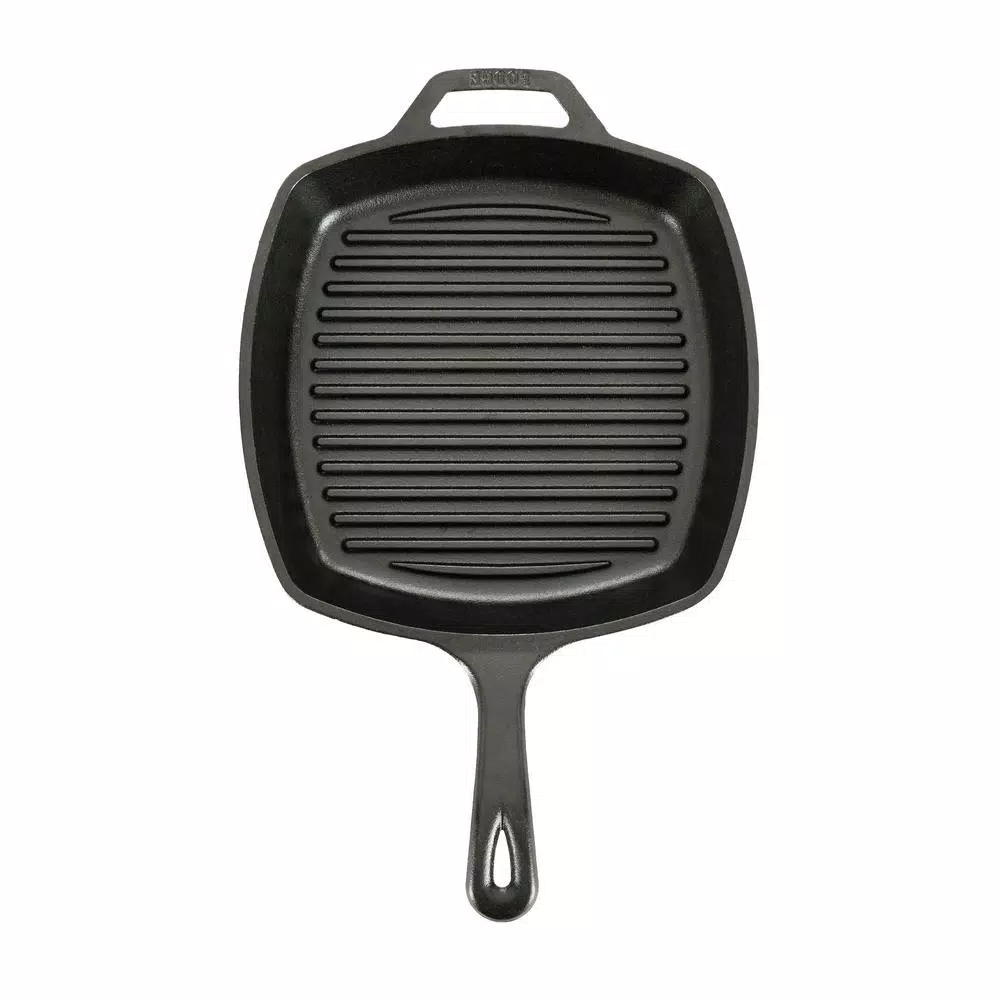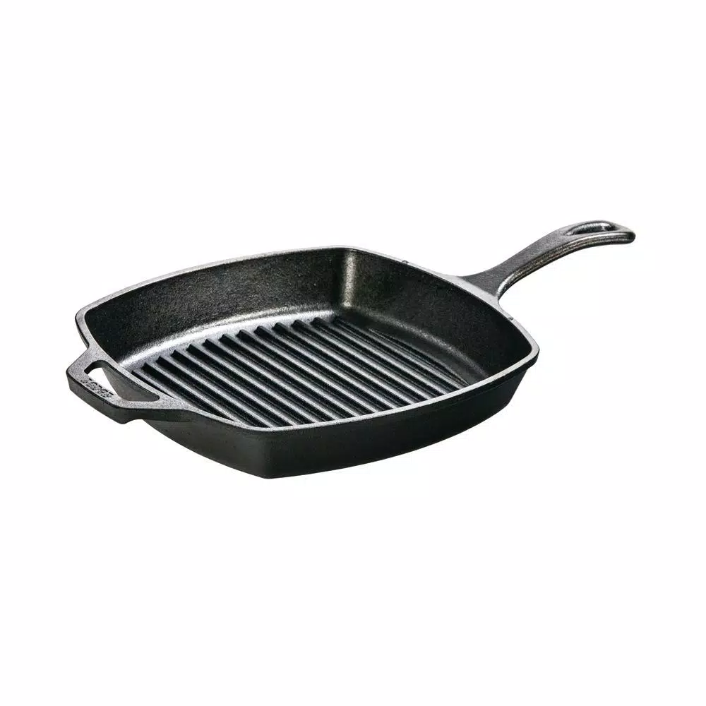 Seasoned 10.5 in. Square Cast Iron Grill Pan with assist handle. The ribs of the Lodge square grill pan allows fats to drain from foods while also searing tantalizing grill marks onto meats and vegetables. The griddle is at home in the oven, on the stove, on the grill or over the camp fire.
