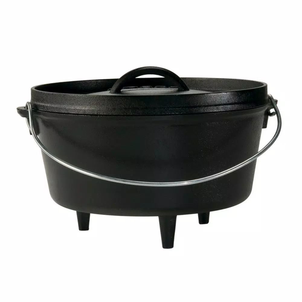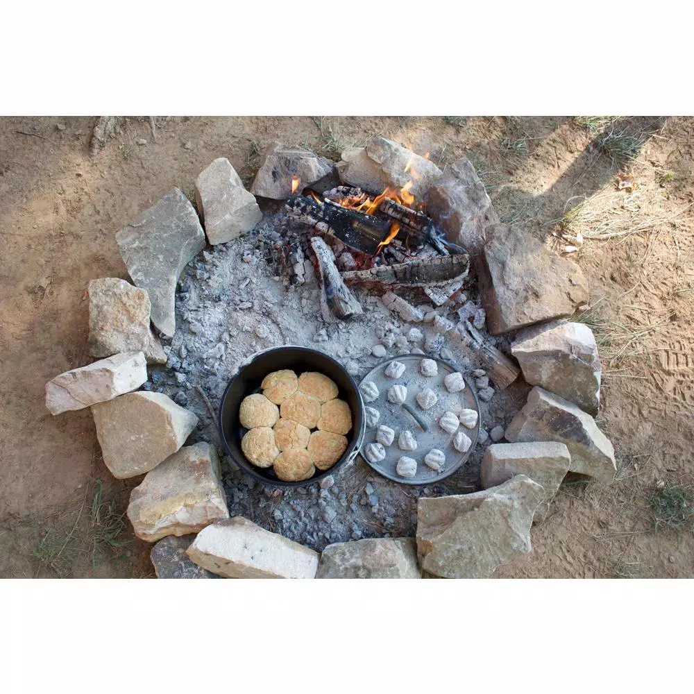 The Lodge portable in. camp stove in. is the pot that does it all. The flanged lid holds hot coals and inverts for use as a griddle. The integral legs allow the oven to sit perfectly over hot coals. The bail handle is for use with a tripod. Includes Camp Dutch Oven Cooking 101 cookbook.