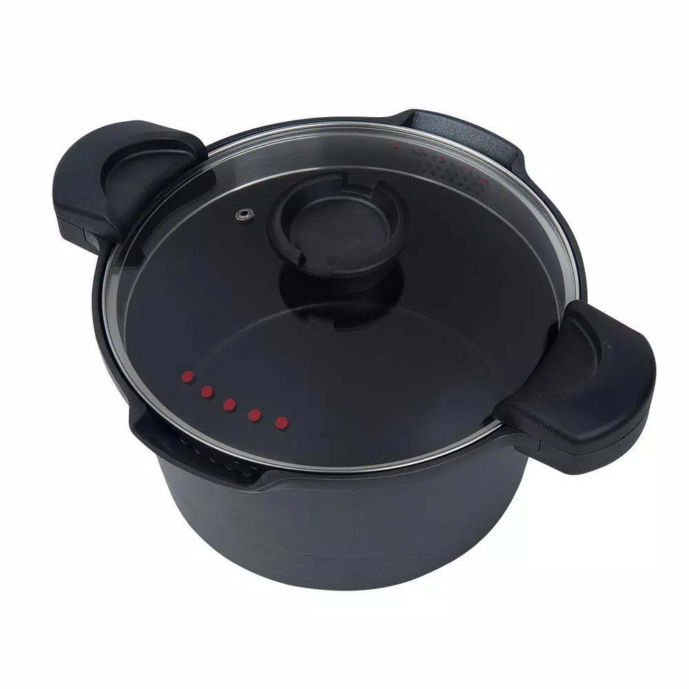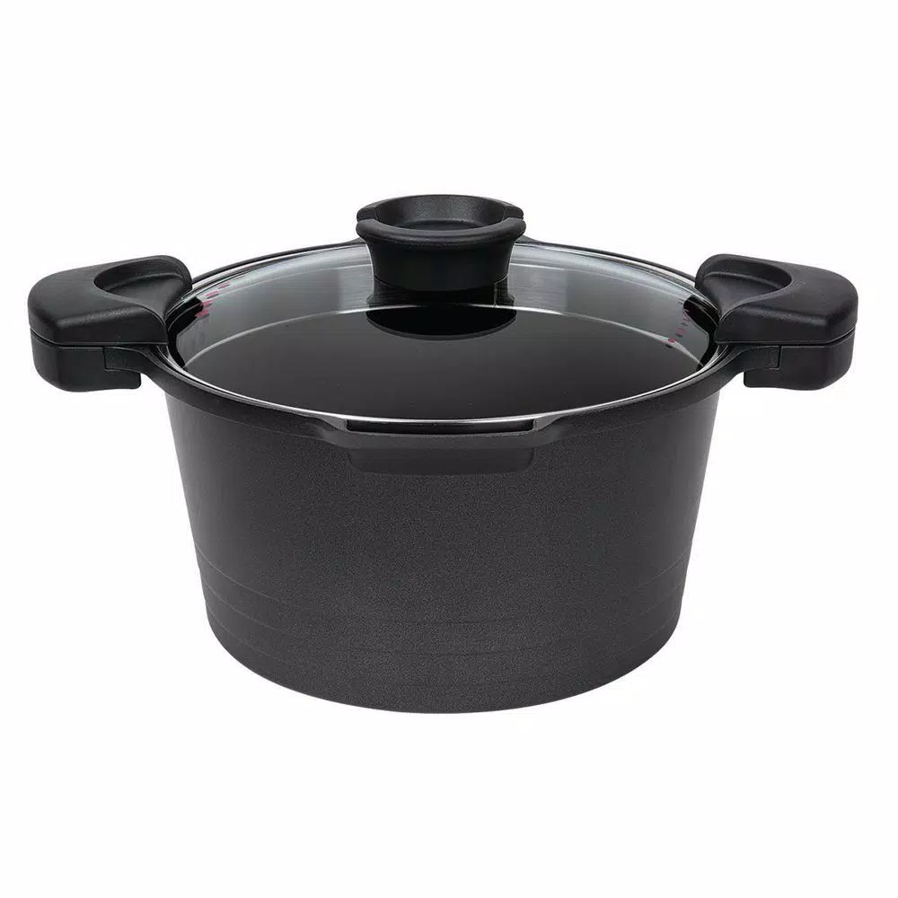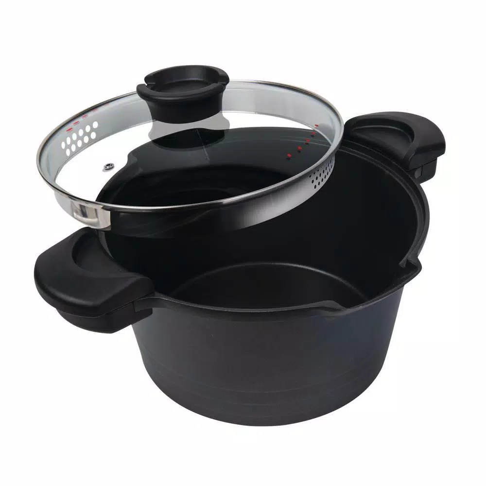 The MasterPan 5 in. x 9 in. 5 Qt. Stock n Pasta Pot can be safely used on any heat source, except induction. With a much longer lifespan than your usual non-stick cookware, its Xylan Plus double layered non-stick technology provides a thick base ideally designed to balance heat flow evenly throughout the entire pot for perfect pasta every time. This safe, easy-to-clean cast aluminum pot boasts a superior non-stick, stain-resistant coating, and is built for daily use. The MasterPan cast aluminum Stock N Pasta Pot features easy-click-and-lock ergonomic handles, a tempered glass lid, and a drip free pouring spout. Cooking flawless pasta has never been this easy. Our products are dishwasher safe, as well as PFOA, lead, cadmium, and heavy metal free.