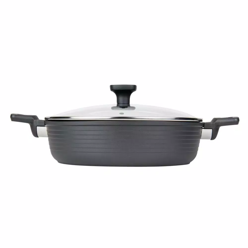- Modern design with ergonomic ss handle: surface has the appearance of black grey marble in interior and exterior; accompanied by a glass lid, an ergonomically designed stainless steel handle for ease and comfort while cooking, as well as a helper handle for easy lifting; a beautiful addition to your kitchen; optimal size for day-to-day cooking.