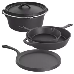 The MegaChef 5-Piece Cast Iron Cookware Set is perfect for sauteing, searing, pan-frying, baking, broiling, roasting, soups and stews. Cook all your favorite meals in your new favorite cast iron cookware set. With the lifelong durability and versatility, the cast iron set combines rich heritage with modern needs. Offering a healthier alternative to nonstick cookware, the cast iron distributes heat evenly for a more flavorful dining experience. This cookware also moves seamlessly from the refrigerator to the stove-top or oven to the table for easy serving.