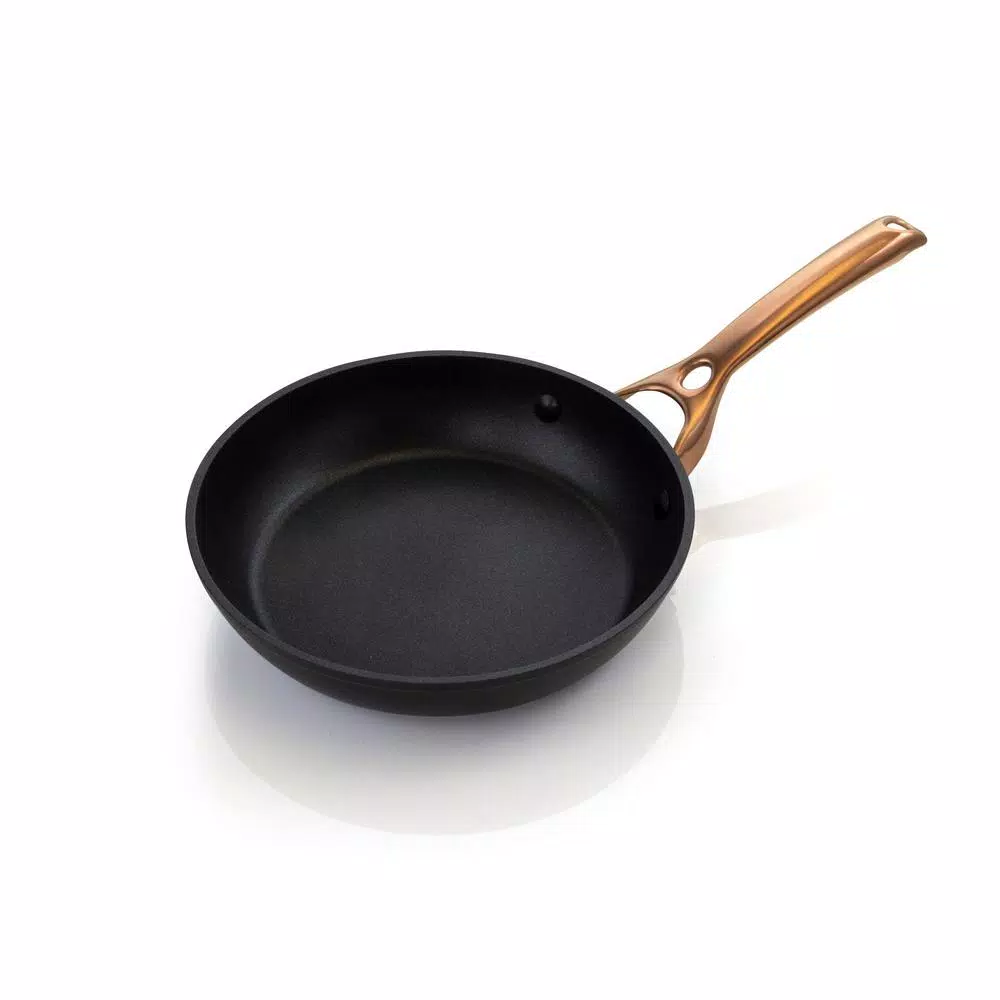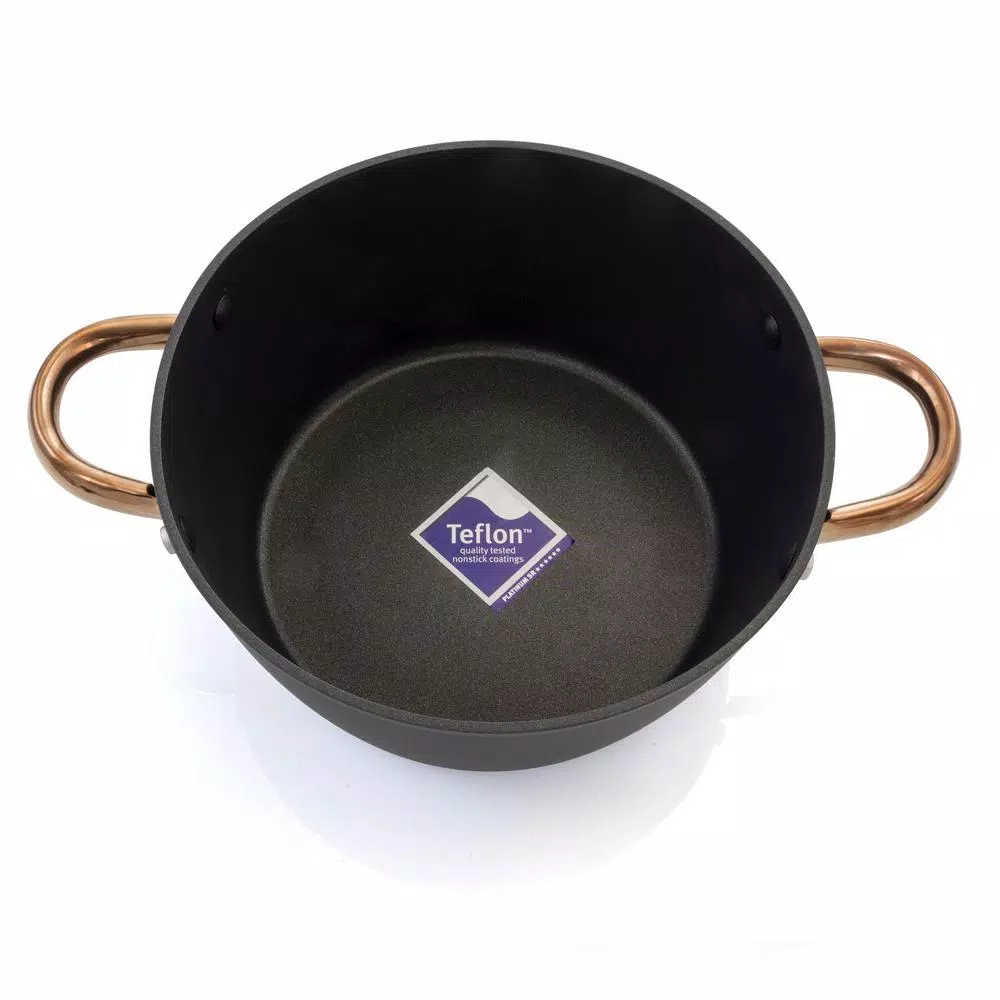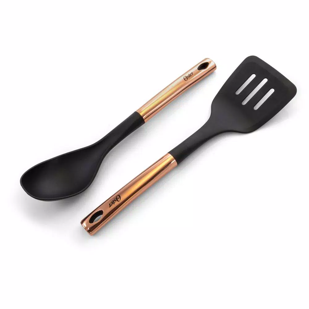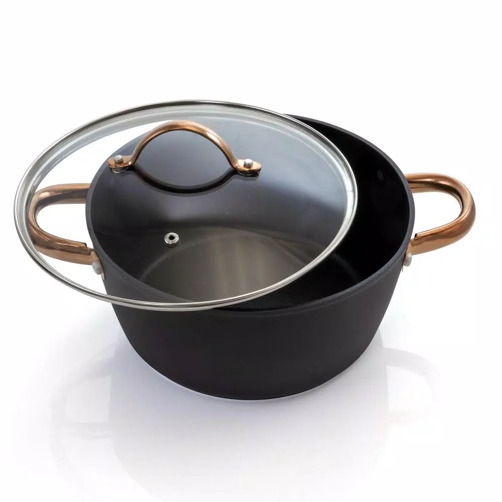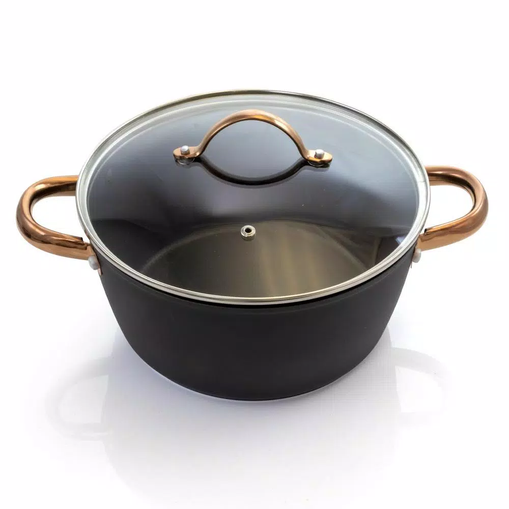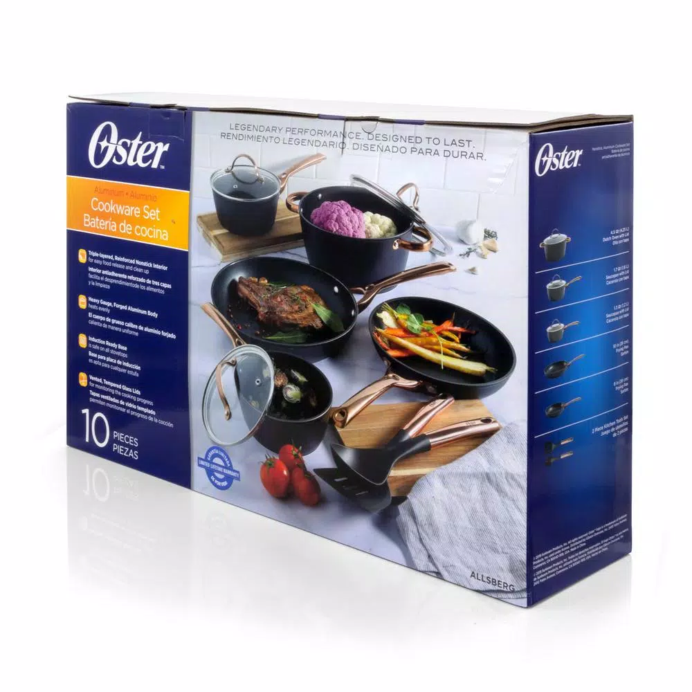 Adorn the home kitchen with the elegant styling of the Oster Allsberg 10-piece aluminum nonstick cookware set with lids and bronze handles. The cookware setβs simple design follows black aluminum construction with stunning bronze handles for a luxurious accent. This setβs aluminum build evenly distributes heat for well controlled cooking. Itβs compatible with gas, electric, vitroceramic, and induction cooking tops. The triple layered nonstick teflon coating keeps the cooking process easy and healthy with less required oils and fats. Cover up your food for better heating and monitor the full cooking process with the tempered glass lids. Cook with the non-scratching nylon cooking tools that also have bronze handles to match the set.