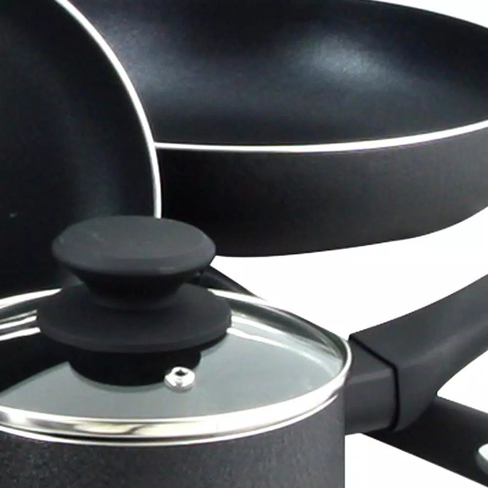- Set includes one 5 Qt. dutch oven with lid, one 1.8 Qt. saucepan with lid, one 1-Qt. saucepan with lid, one 9.5 in. frying pan, one 8 in. frying pan, 1-serving spoon and 1-slotted turner