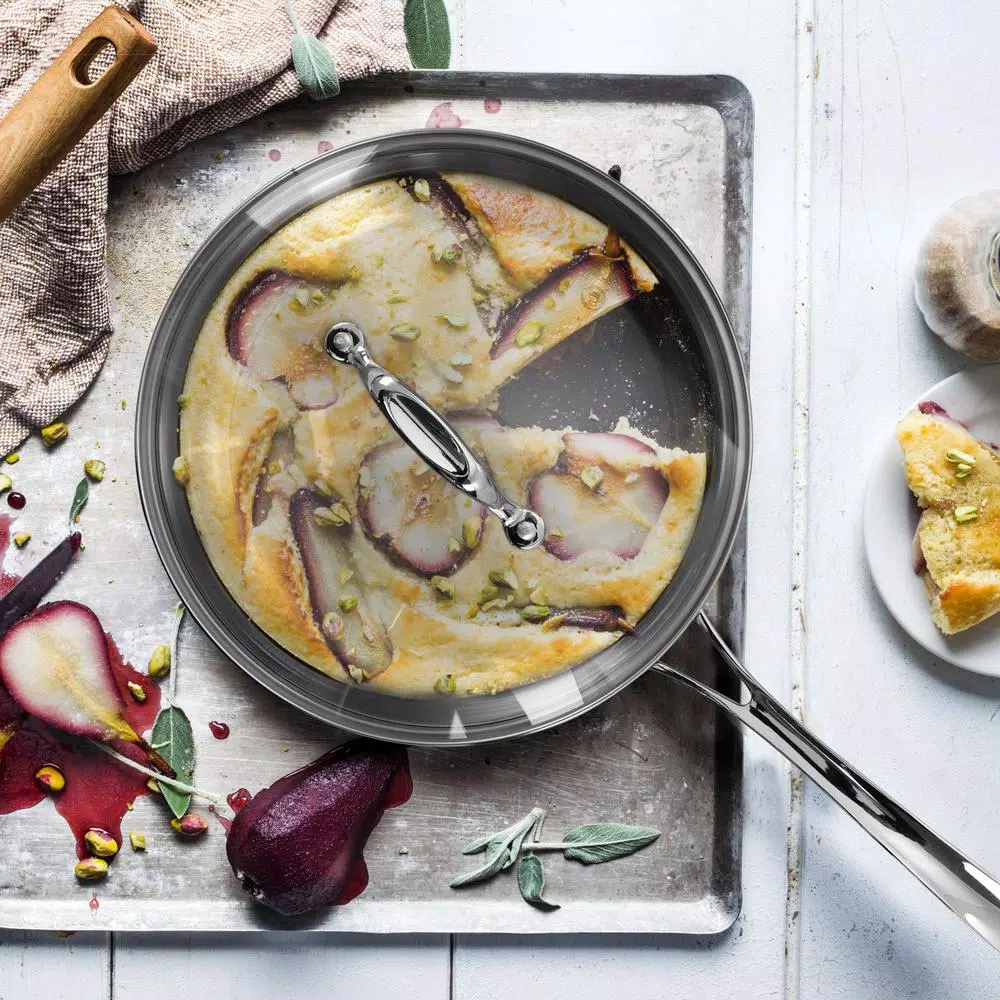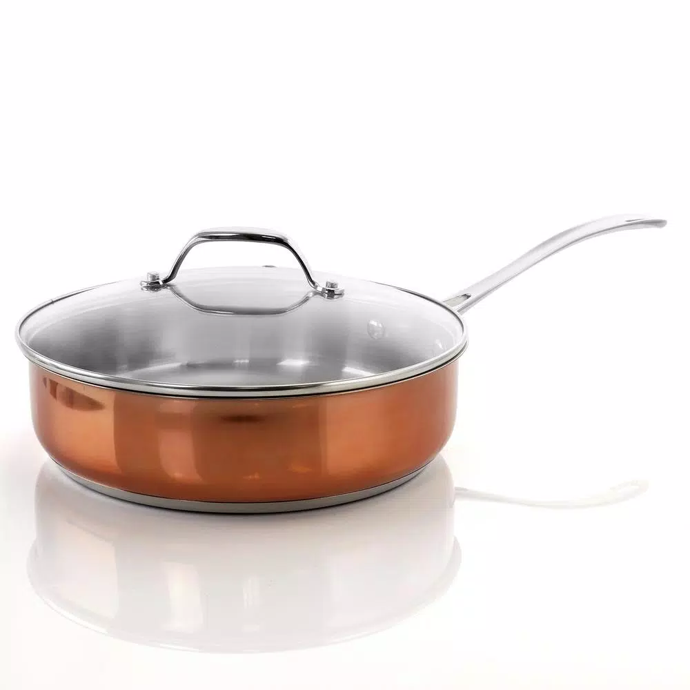 The Oster Carabello 2-piece 3.5 Qt. stainless steel saute pan with lid in copper is a slim and elegantly shaped saute pan best suited for any casual or professional chef. The cookware is plated with an appealing copper finish that splashes color to your standard kitchen cookware set up. Riveted handles strengthen the build for long lasting durability. Make flavorful pasta dishes, saute beef with veggies, cook up rice dishes, or fry breaded chicken for delicious fried chicken. Monitor the full cooking process with the vented tempered glass lid.