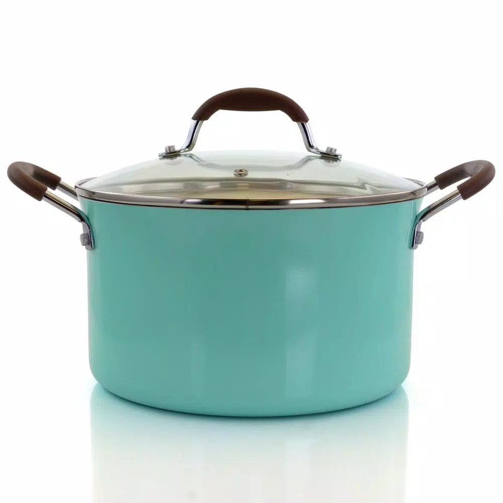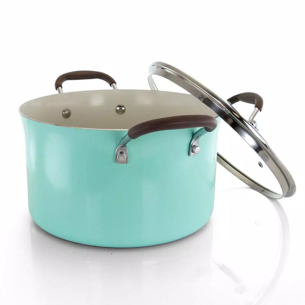 The Oster Carrick 2-Piece 6 Qt. Aluminum Dutch Oven allows the user to create fantastical meals. Made of aluminum that provides even heating, the pot works well for making chicken stock, cooking noodles, boiling soup and more. Cut back on fats and oils with the ceramic nonstick interior coating that makes for easier cooking and fast cleaning. It comes with soft touch, easy grip, bakelite handles that avoid scalding hot handles for safe handling.