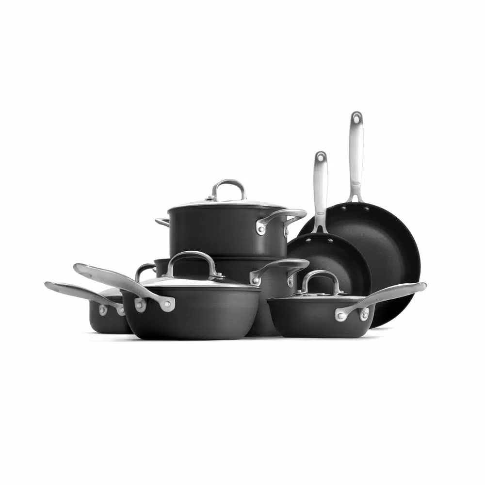 The OXO Good Grips Non-Stick Pro 12-Piece Cookware Set is made with scratch-resistant, hard-anodized aluminum for maximum durability and superior heat retention. Coated with our signature 3-layer German-Engineered, PFOA-free, Non-Stick coating for effortless food release using less oil, this piece is also dishwasher safe for additional convenience. Unique rolled edges are designed for drip free pouring and contoured stay-cool handles provides a comfortable, safe and secure grip and allow for oven and broiler use. Tempered glass lid allows for easy monitoring of your food without losing the heat. Experience the difference with OXO.