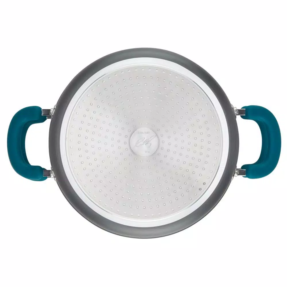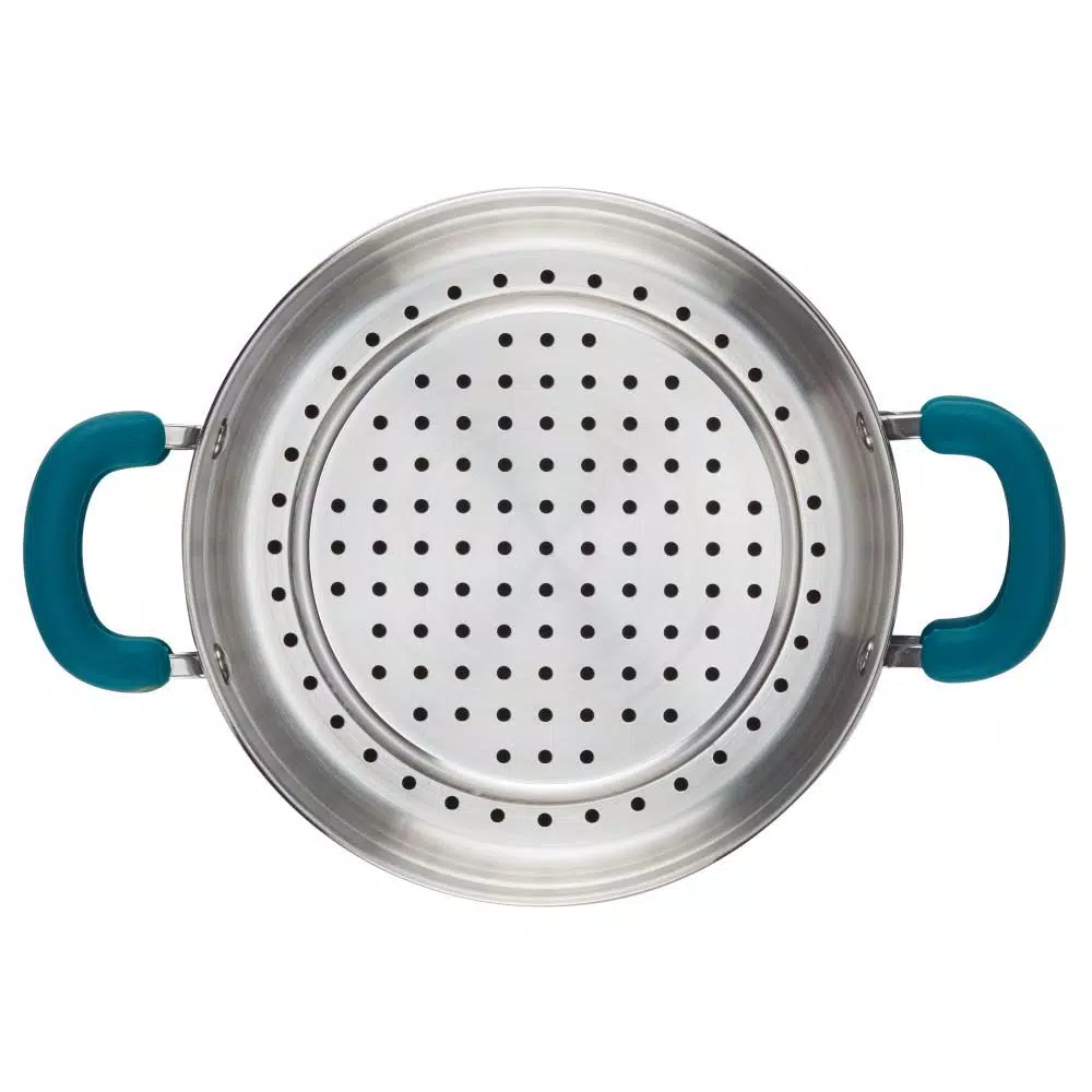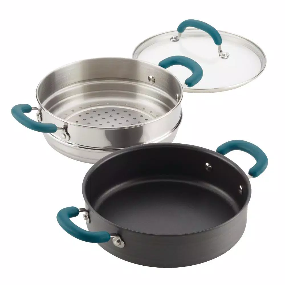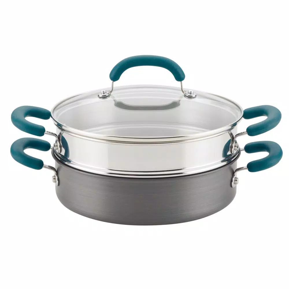 Radiant and solution-oriented, the Rachael Ray Create Delicious Hard Anodized Aluminum Nonstick 3 qt. Steam Set brings high performance and easy convenience to home chefs eager for kitchen versatility with style. Featuring vibrant, shimmering color combined with value-driven functionality, this eye-catching steamer set includes a 3 qt. covered sauteuse and stainless steel insert for steaming vegetables, seafood, pot stickers and more. The sauteuse’s durable hard-anodized aluminum construction is twice as hard as stainless steel, provides ultra-even heating, and features enhanced PlatinumShield Technology black nonstick reinforced to be 9 times harder than titanium for effortless food release. Colorful, double-riveted stainless steel and silicone handles provide comfort and control thats oven safe to 400°F, and a shatter resistant glass lid lock in heat and flavor while allowing foods to be monitored while they steam. Flared cookware rims make for easy pouring, and an induction-suitable stainless steel base provides strength, durability, and versatility to use the cookware on any stovetop. From easy cleaning convenience to the enhanced durability of hard-anodized construction and PlatinumShield nonstick, reach for the easy brilliance of the Rachael Ray Create Delicious Hard-Anodized Aluminum Nonstick 3 qt. Steam Set and get ready to get delish.