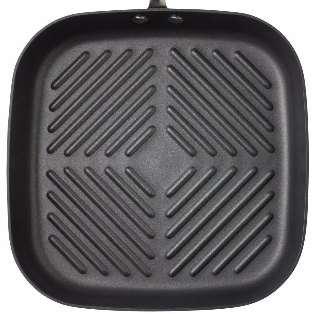 Enjoy grilling rain or shine with the Rachael Ray 11-Inch Hard Anodized Nonstick Deep Square Grill Pan. The sturdy and durable hard anodized indoor grill pan is the ideal solution to indoor grilling as it promotes even heat distribution to thoroughly and evenly cook any meal on your stovetop, while raised ridges provide an authentic steakhouse sear when grilling indoors. The nonstick grill pan has a dual-riveted handle for comfort and control while cooking and moving around in the kitchen, and is oven safe to 350Β°F to make finishing dinner off in the oven a simple task. Whether grilling steaks or grilling burgers or grilling chops, the enhanced nonstick makes food release a breeze, and the nonstick grill pan is dishwasher safe for quick and easy cleanup. Enjoy steaks, chops, burgers and more when cooking with Rachael Rayβs Hard Anodized 11-Inch Nonstick Deep Square Grill Pan.
