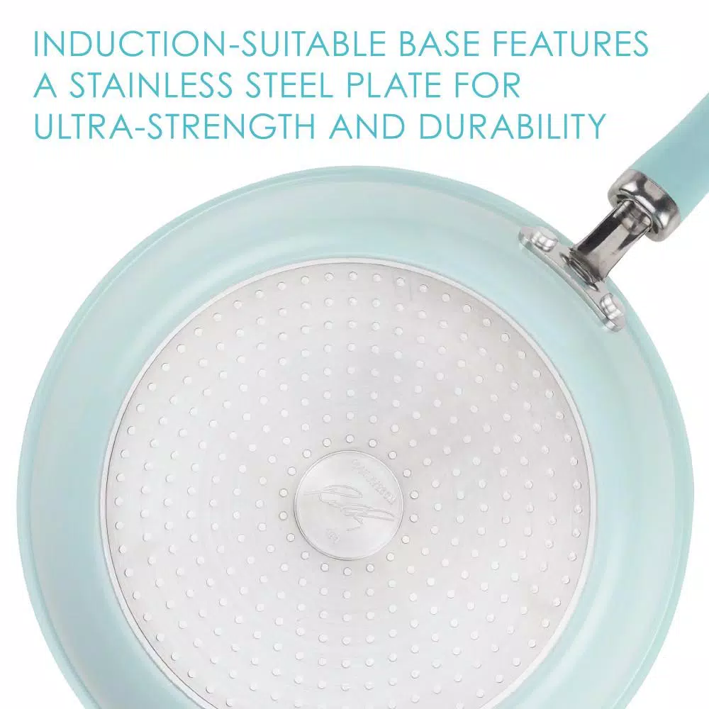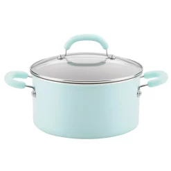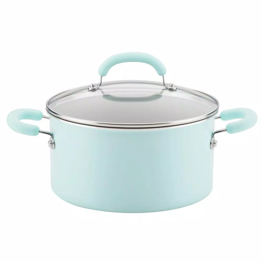 Radiant and solution-oriented, the Rachael Ray Create Delicious Aluminum Nonstick 6-Quart Stockpot brings high-quality performance and everyday convenience to home chefs eager for kitchen versatility with style.Featuring vibrant, shimmering color combined with value-driven functionality, this roomy stockpot is perfect for soups, stews, stoups and one-pot meals like Rachโs Sausage and Shrimp. Durable aluminum construction provides ultra-even heating and features enhanced PlatinumShield Technology silver nonstick reinforced to be 9 times harder than titanium for effortless food release. Plus, the stockpot is dishwasher safe for quick and easy cleanup.Want more? Colorful, double-riveted stainless steel and silicone handles provide comfort and control thatโs oven safe to 400F, and a shatter resistant glass lid locks in heat and flavor while allowing foods to be monitored while they cook. Flared cookware rims make for easy pouring, and an induction-suitable stainless steel base provides strength, durability, and versatility to use the cookware on any stovetop.From dishwasher-safe convenience to the enhanced durability of PlatinumShield nonstick, reach for the big brilliance of the Rachael Ray Create Delicious Aluminum Nonstick 6-Quart Stockpot and get ready to get delish.