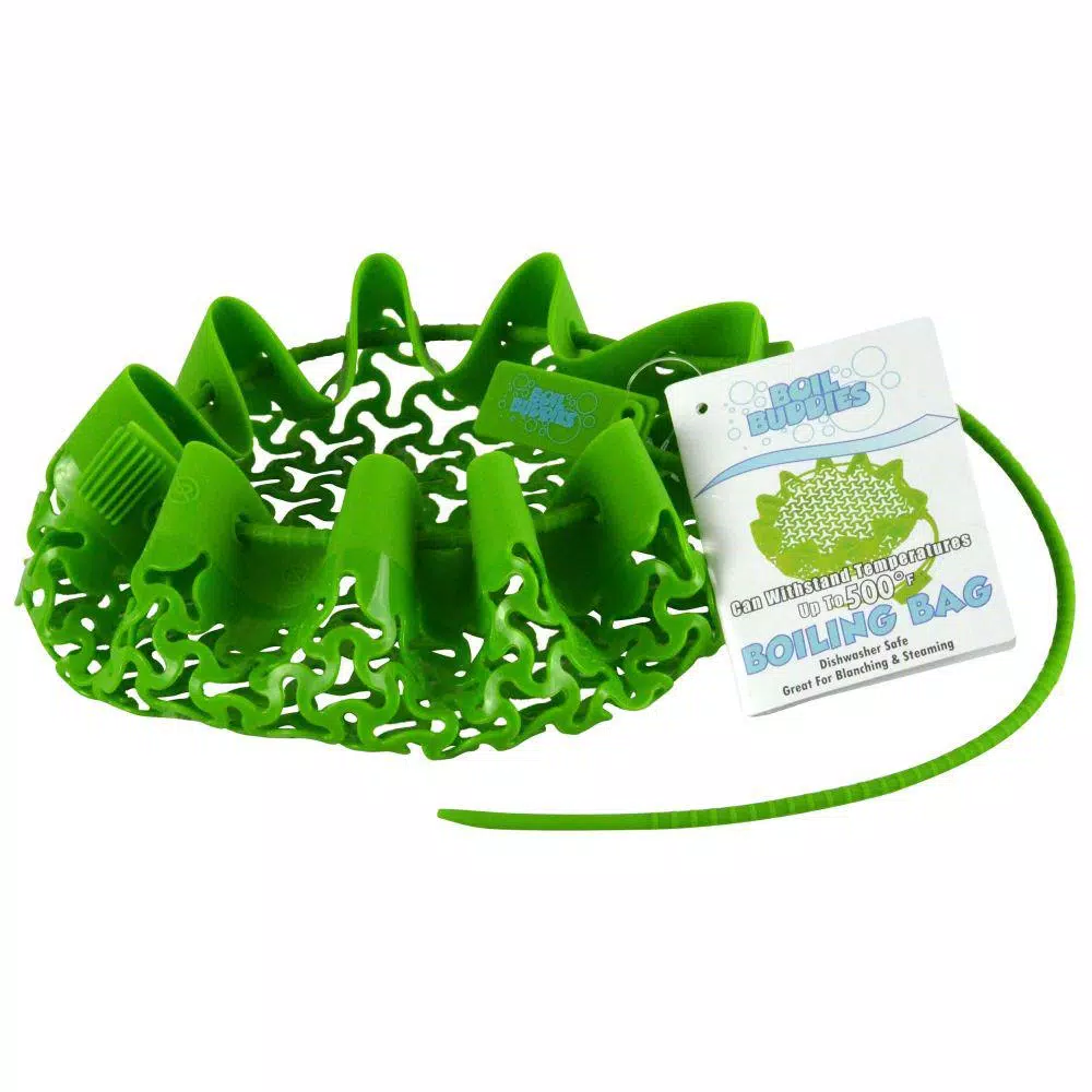 This Boil Buddies by Southern Homewares brand Silicone bag makes an excellent addition to any kitchen arsenal. Simply place the desired food in the Boil Buddies Boiling Bag and pull the draw string tight. Then place the bag and itβs contents in the pot of boiling water and cook till done. Once the food has cooked the perfect amount, easily remove the bag by the drawstring and youβre done. We suggest using pot holders to remove the bag and watch out for hot steam. Bag is green in color. When laid out completely flat the bag has a 12 in. diameter.